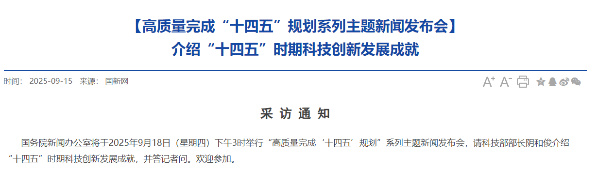 国务院新闻办公室将于2025年9月18日(星期四)下午3时举行“高质量完成‘十四五’规划”系列主题新闻发布会,请科技部部长阴和俊介绍“十四五”时期科技创新发展成就,并答记者问。