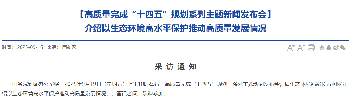 国务院新闻办公室将于2025年9月19日(星期五)上午10时举行“高质量完成‘十四五’规划”系列主题新闻发布会,请生态环境部部长黄润秋介绍以生态环境高水平保护推动高质量发展情况,并答记者问。