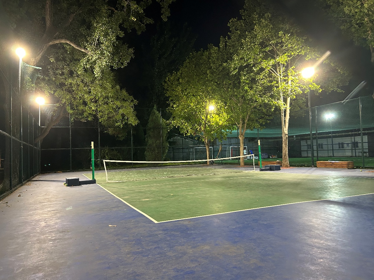 有的场地是灯光不足,还有的场地则是灯光太亮。网球爱好者蓝先生,曾经预约过龙潭中湖公园的一块网球场,到了现场才发现,这是区别于正规场地的一片训练场。场地完全是由排球场改过来的,球场尺寸比正规网球场要小,中间的网带也只是简单系了一下,完全“耷拉”着。