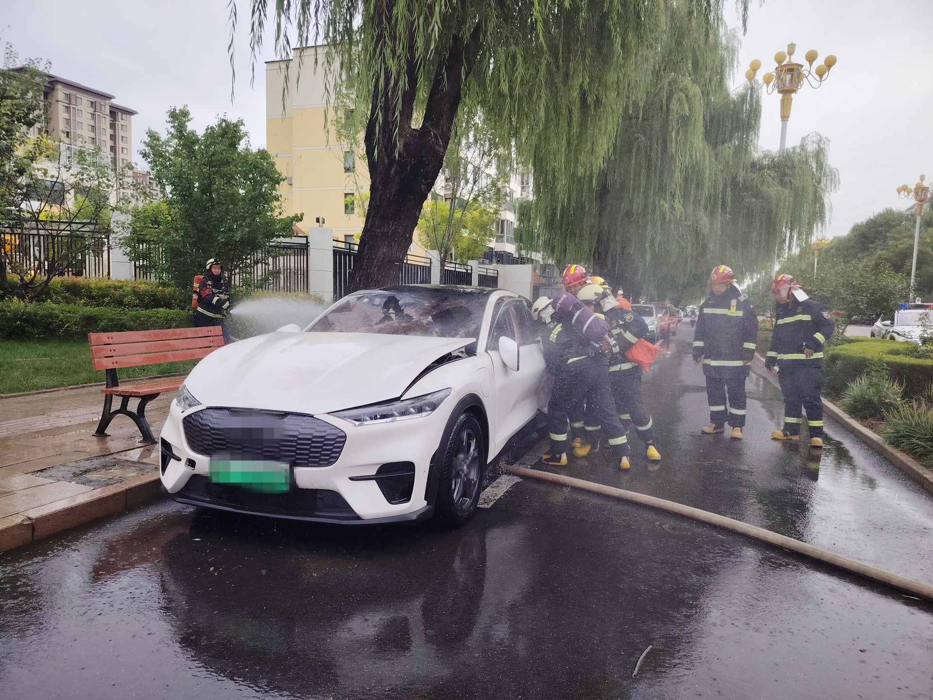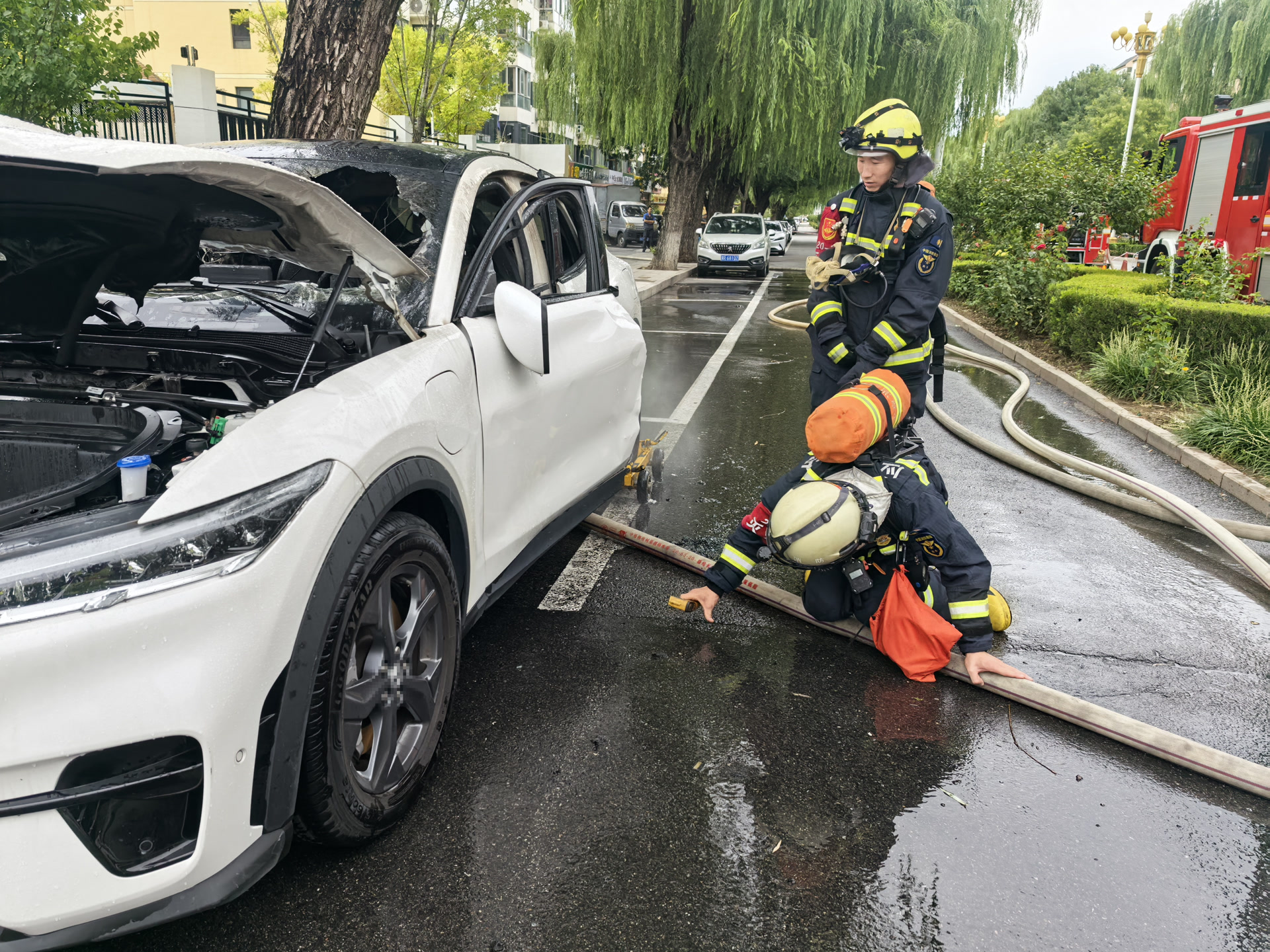 当天消防员抵达现场后看到,涉事新能源汽车未出现明火,车辆底盘和车内有冒烟情况。“车辆起火不同于一般固体物质起火,不确定因素较多,要严格做好自身防护,同时适当扩大警戒范围。”带队指挥员李乾坤一边安全提示,一边命令队员对现场进行处置。