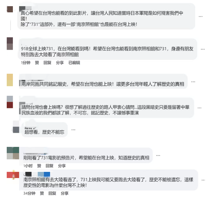 很多台湾网友也通过“看台海”境外平台留言呼吁电影在台上映,“大陆、香港、澳门都上映,台湾也不能缺席”“这样真实的历史题材电影为什么台湾不上映!”“真心希望在台湾也能看到此片,让大家知道日本侵略者是如何残害我们中国人的!”
