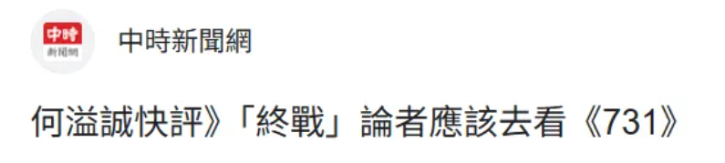 有岛内学者指出,在当前台湾被民进党当局长期“媚日”荼毒的背景下,许多台湾民众对日军731部队罪恶的历史知之甚少。尤其赖清德还频发以“终战”取代“抗战胜利”谬论、淡化甚至阻挠岛内民众纪念抗战胜利,电影《731》能够在台上映是非常必要且有意义的。台湾青年联合会理事长何溢诚发表评论文章《“终战”论者应该去看〈731〉》指出,任何人试图用“终战”一词掩饰侵略本质,都是对历史的公然亵渎,这些人更应该去看看《731》,让无可辩驳的史实成为刺穿谎言的警钟。
