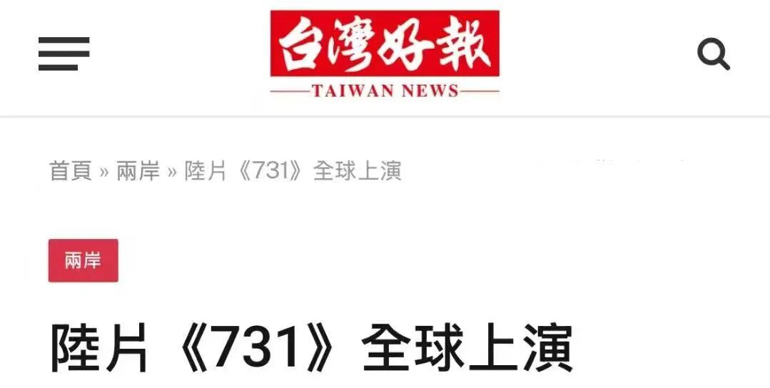 中时新闻网、台湾全球新闻网等20多家岛内媒体第一时间注意到海报上“全球上映”四个字,认为日军的暴行不仅是中国人的伤痛,更是全人类文明的伤疤。台湾YES新闻网报道称,影片呈现了侵略者试图掩盖事实的过程,以及中国人民还原历史真相的过程。台湾雅虎新闻报道指出,《731》电影全球上映,让罪恶无处遁形,让真相传遍世界,唤醒世界对历史真相的警醒。