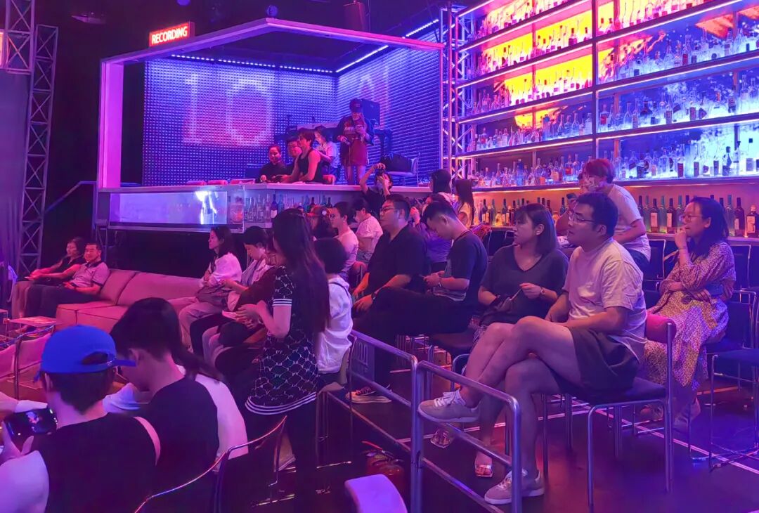 演出现场没有固定的阶梯座椅,观众可倚靠复古吧台、穿梭于错落的演出区域,仿佛置身一间充满戏剧感的酒吧。随着剧情展开,观众逐渐从“旁观者”转变为“参与者”。当演员集体有大段台词和整体调度时,会让现场观众拿起与大屏幕相接的手机进行实时拍摄;当剧情推进到“排练陷入瓶颈”的桥段,演员会随机与观众互动,收集“创意灵感”;当角色之间面对能决定“酒吧存亡”的决策而产生分歧时,会到观众席的沙发区域中进行隔空理论。