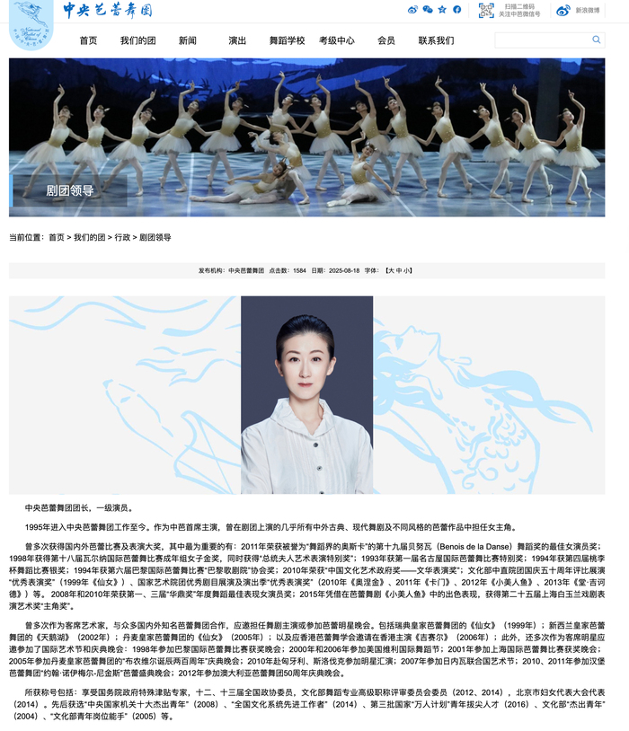 中央芭蕾舞团网站更新显示,一级演员朱妍已担任中央芭蕾舞团团长。