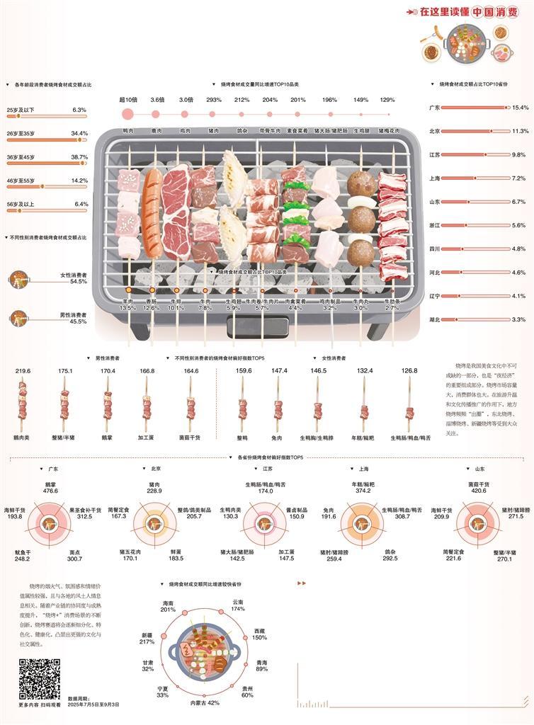 烧烤虽然简单,但却对食材的新鲜程度有较高要求,考验的是对食材特点的把握和对火候的掌控。数据显示,牛肉与羊肉是消费者最为喜爱的烧烤食材。其中,羊肉成交额最高,牛肉产品在前十大烧烤食材榜单中上榜数量最多。此外,随着消费者尝新尝鲜的需求不断提升,一些小众烧烤食材脱颖而出,销售额快速增长。数据显示,鸭肉、鹿肉、鸽子内脏(鸽杂)的成交量均实现数倍提升。