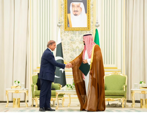 沙特阿拉伯王储兼首相穆罕默德·本·萨勒曼与到访的巴基斯坦总理夏巴兹·谢里夫握手(路透社报道图)