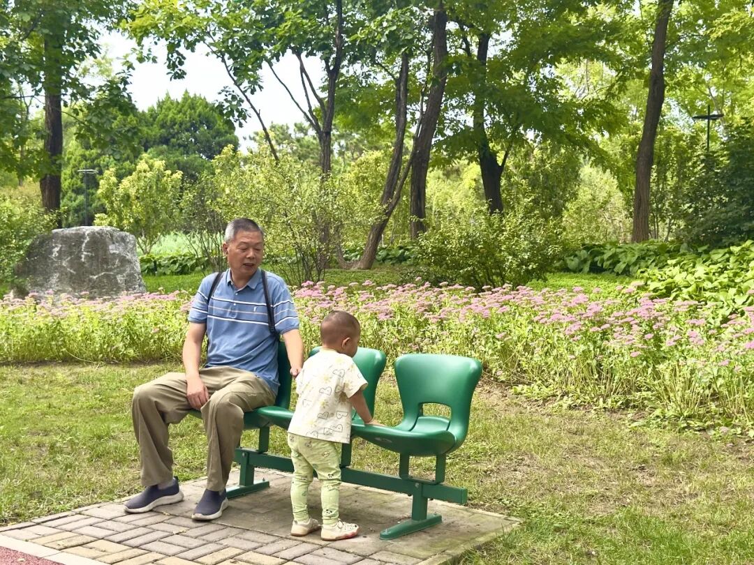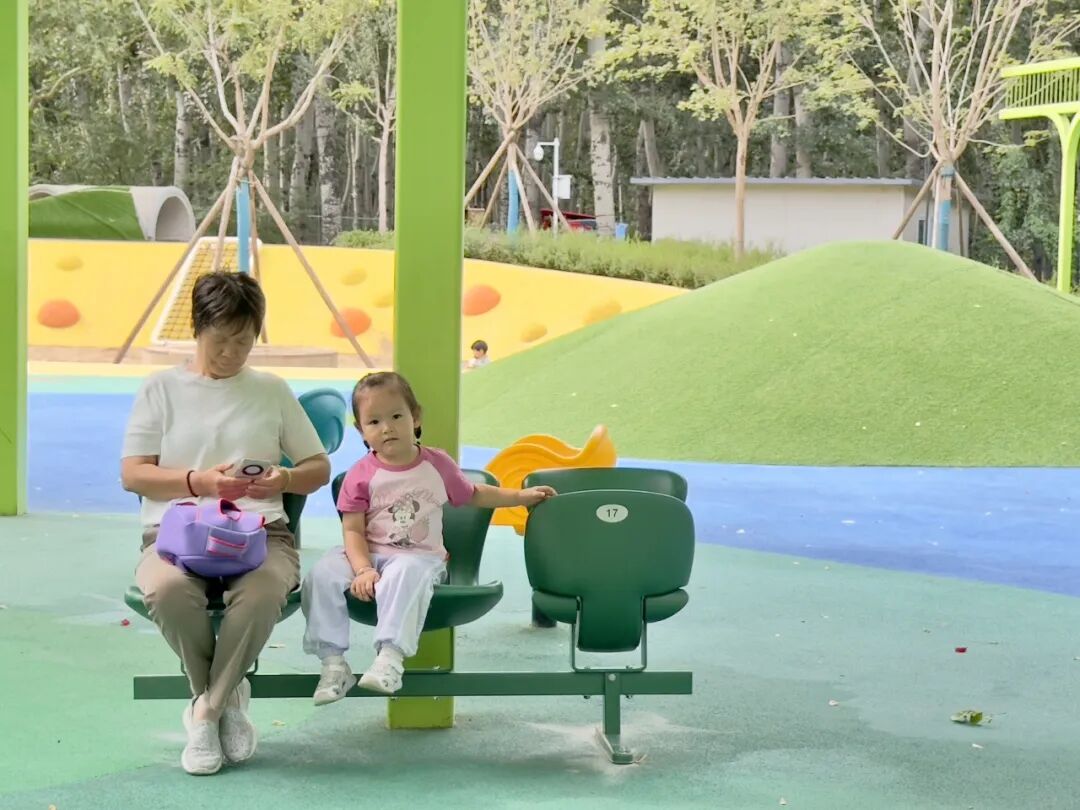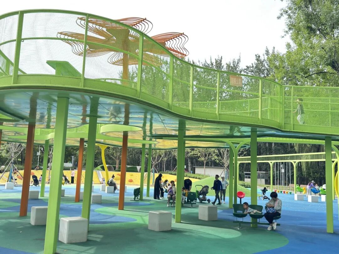 在四得公园东南部的园路上,几组橄榄绿座椅背后是高大挺拔的彩叶树,以及盛放的粉紫色时令花卉,设施与自然美景相辉映,吸引不少游客前来打卡。在梦幻自然·儿童乐园,橄榄绿座椅与乐园内绿色、橙色的滑梯、攀爬架、秋千等碰撞出温暖、活力的氛围,成为亲子休憩放松的好地方。