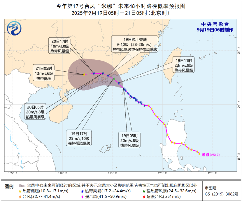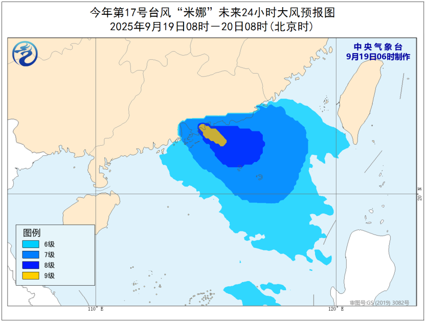 大风预报:19日08时至20日08时,南海北部和东部、台湾南部沿海、福建南部沿海、广东沿海将有6-7级大风,阵风8-9级,其中,广东中东部沿海、南海东北部的部分海域风力有8-10级,阵风11-12级。