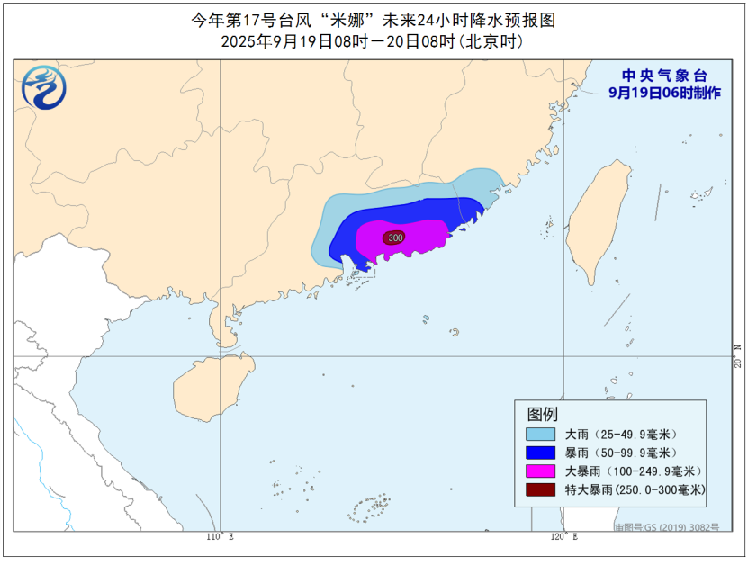 降水预报:19日08时至20日08时,福建东南部、广东中东部等地的部分地区有大到暴雨,其中,广东东南部等地的部分地区有大暴雨,局地特大暴雨(250~300毫米)。