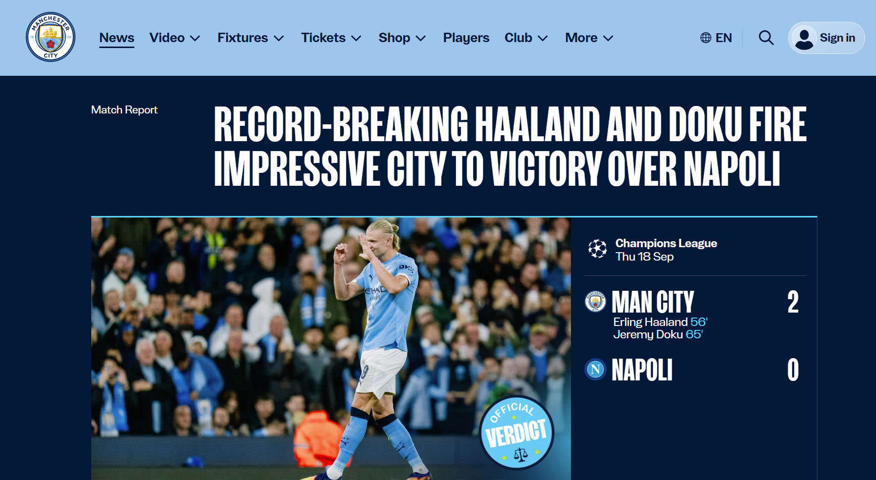 不过,比赛第21分钟的变故让比利时球星没能像过去一样在阿提哈德球场展现才华:那不勒斯队长迪洛伦佐放倒形成单刀的哈兰德,被主裁判红牌罚下。5分钟后,那不勒斯队主帅孔蒂就用后卫奥利韦拉换下德布劳内。此后的比赛,多一人的曼城占据绝对优势,哈兰德和多库在下半场各入一球,帮助球队主场2比0取胜。其中哈兰德还凭借这个进球,达成欧冠生涯50球里程碑,并成为实现这一壮举的最年轻球员。