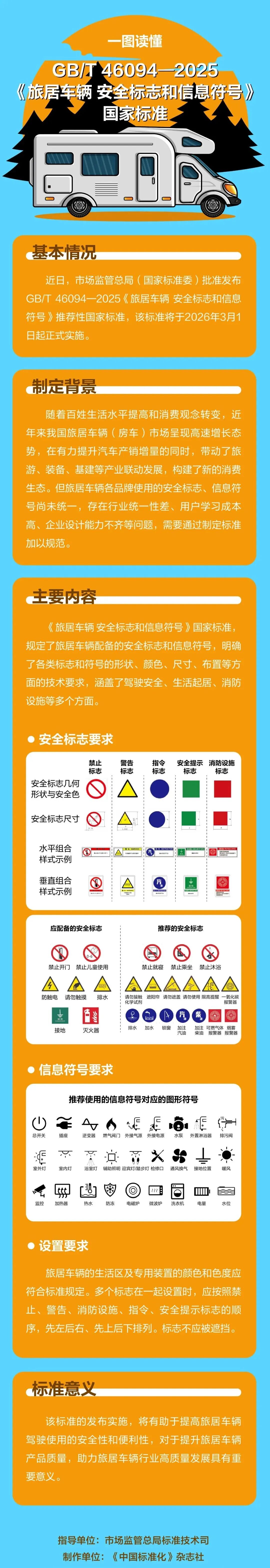 近日,国家市场监督管理总局(国家标准委)批准发布《旅居车辆安全标志和信息符号》(GB/T46094—2025)推荐性国家标准,该标准将于2026年3月1日起正式实施。