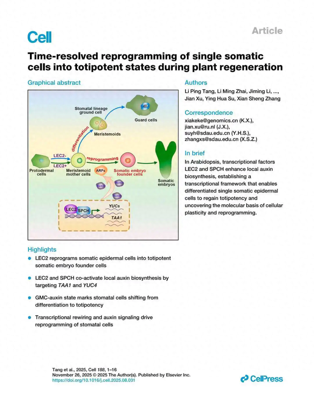 北京时间9月16日22时30分,全球顶级学术期刊《细胞》在线发表山东农业大学研究团队论文,首次揭示了单个体细胞发育成完整植株背后的分子机制。