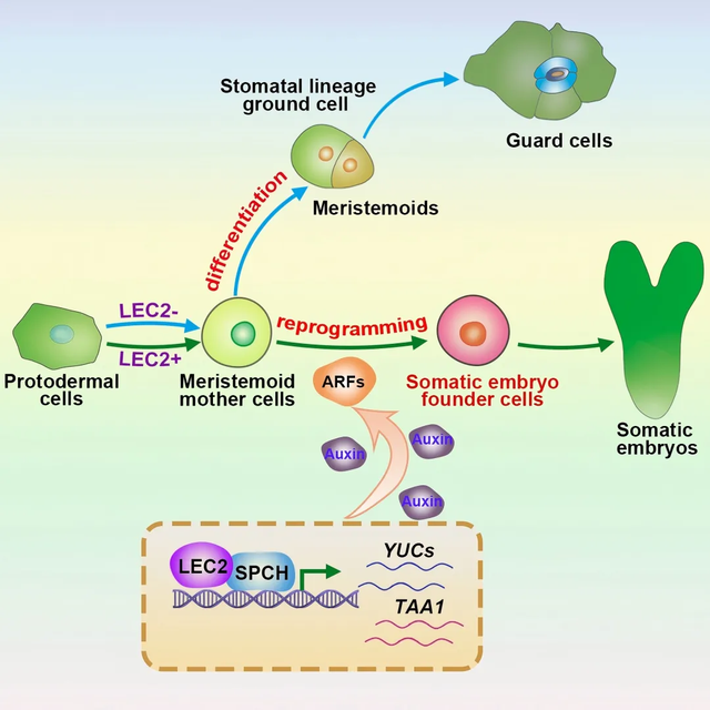 研究首先发现,只有拟南芥叶片体细胞内合成大量生长素,这个“普通细胞”才能变身“全能干细胞”。在此基础上又发现,在叶片气孔前体细胞特有基因SPCH与人工诱导高表达基因LEC2协同作用下,体细胞内才能合成大量生长素。