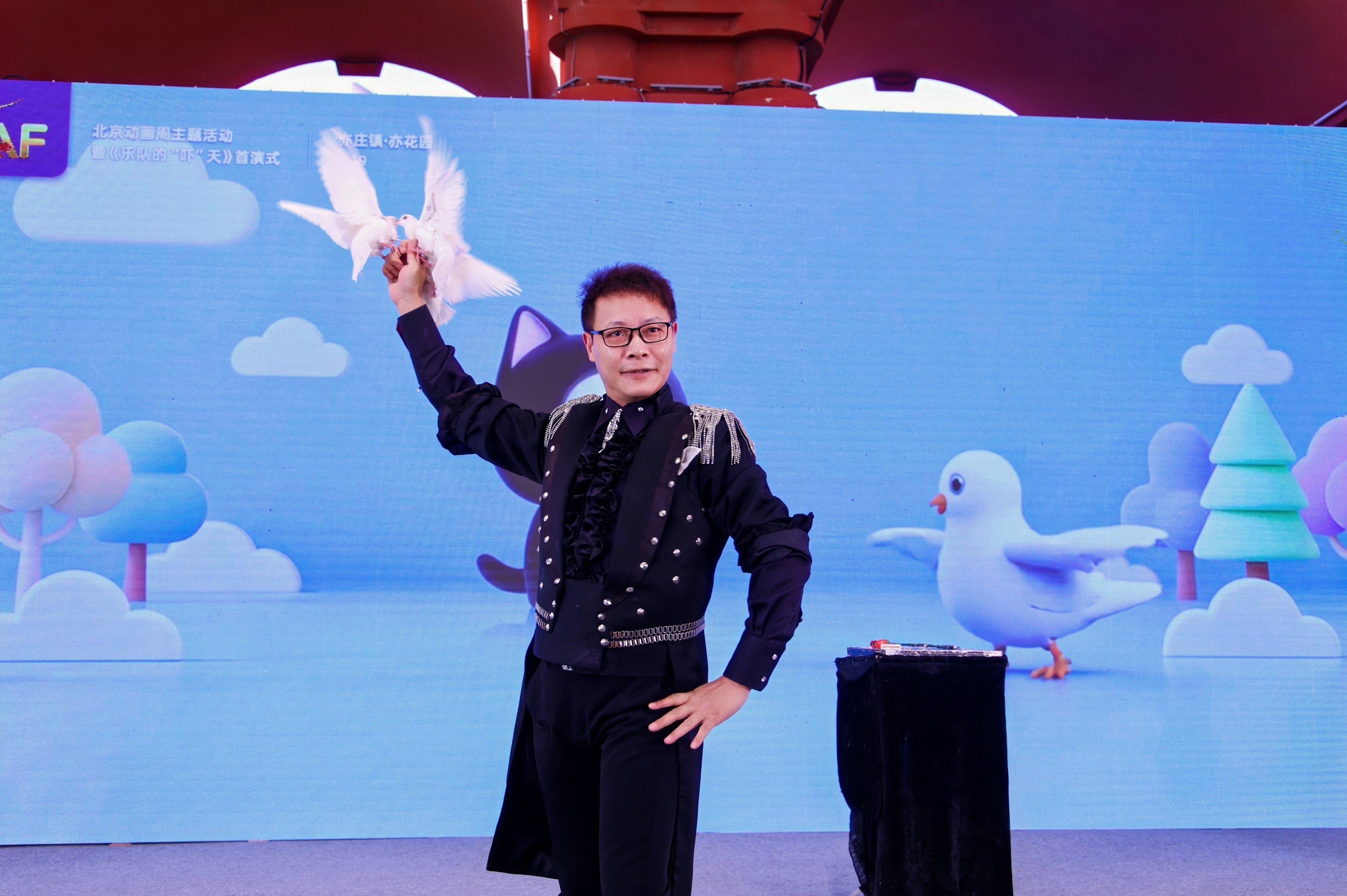 现场演艺中AI动画与演员表演“虚实共生”,开场乐队表演与AI动画视频背景实现人画交融;魔术表演中真实飞鸽与荧幕动画角色“喵咔咔”同台互动;相声表演配合Q版动画背景一起说学逗唱;由亦庄镇AI未来电影研究院制作的AI动画短片《侠客》与歌手演唱共同营造沉浸视听氛围。揭牌环节由萌趣《哇!喵咔咔》AI动画角色呈现厂牌从征集到诞生的动态效果。多种动画创新应用拓展舞台语言的维度,构建科技、动画与喜剧交融的演艺新场景。