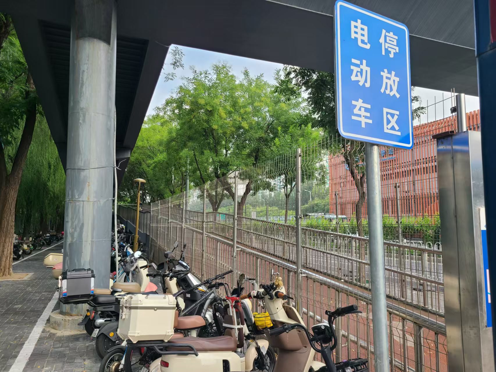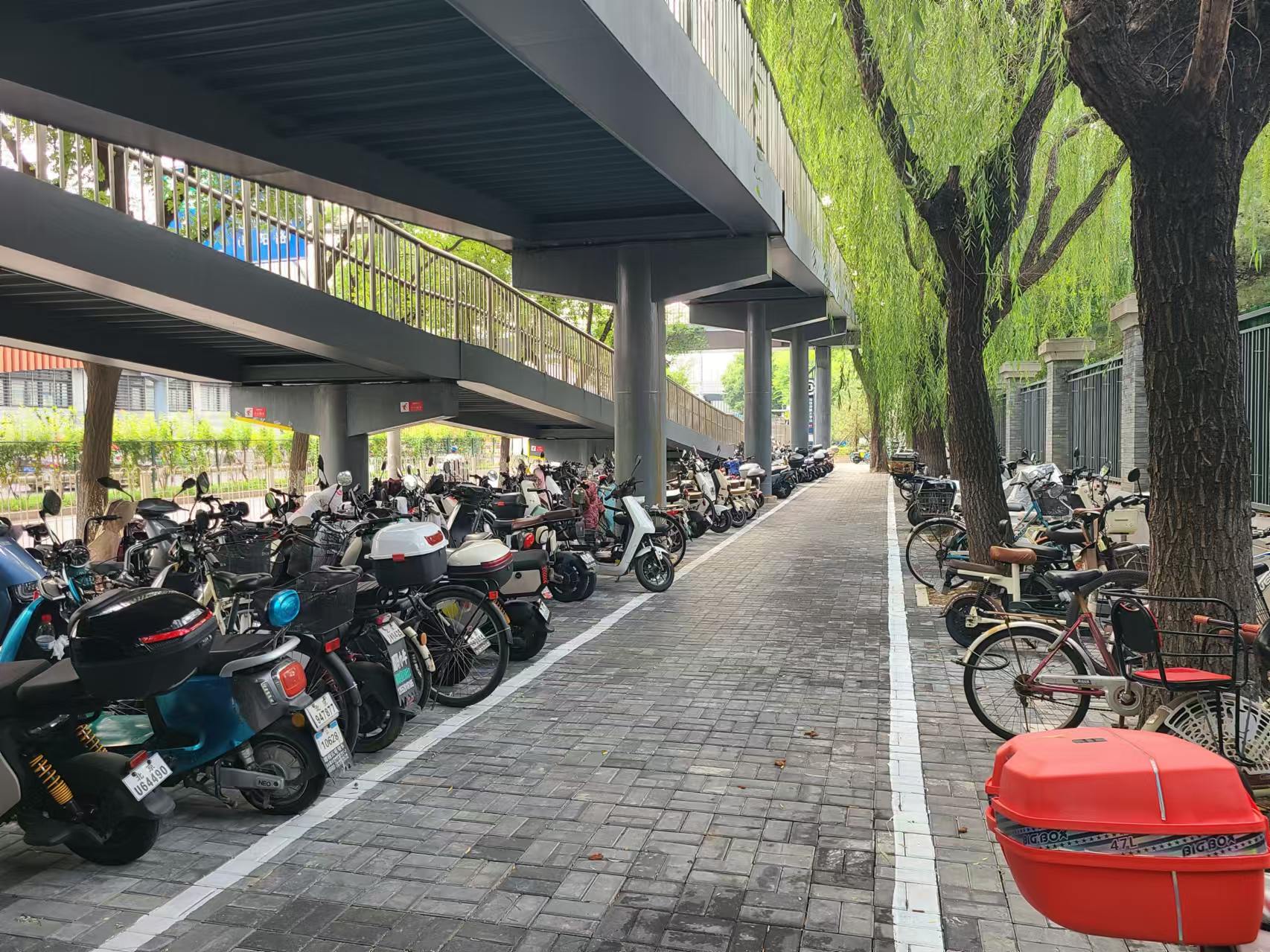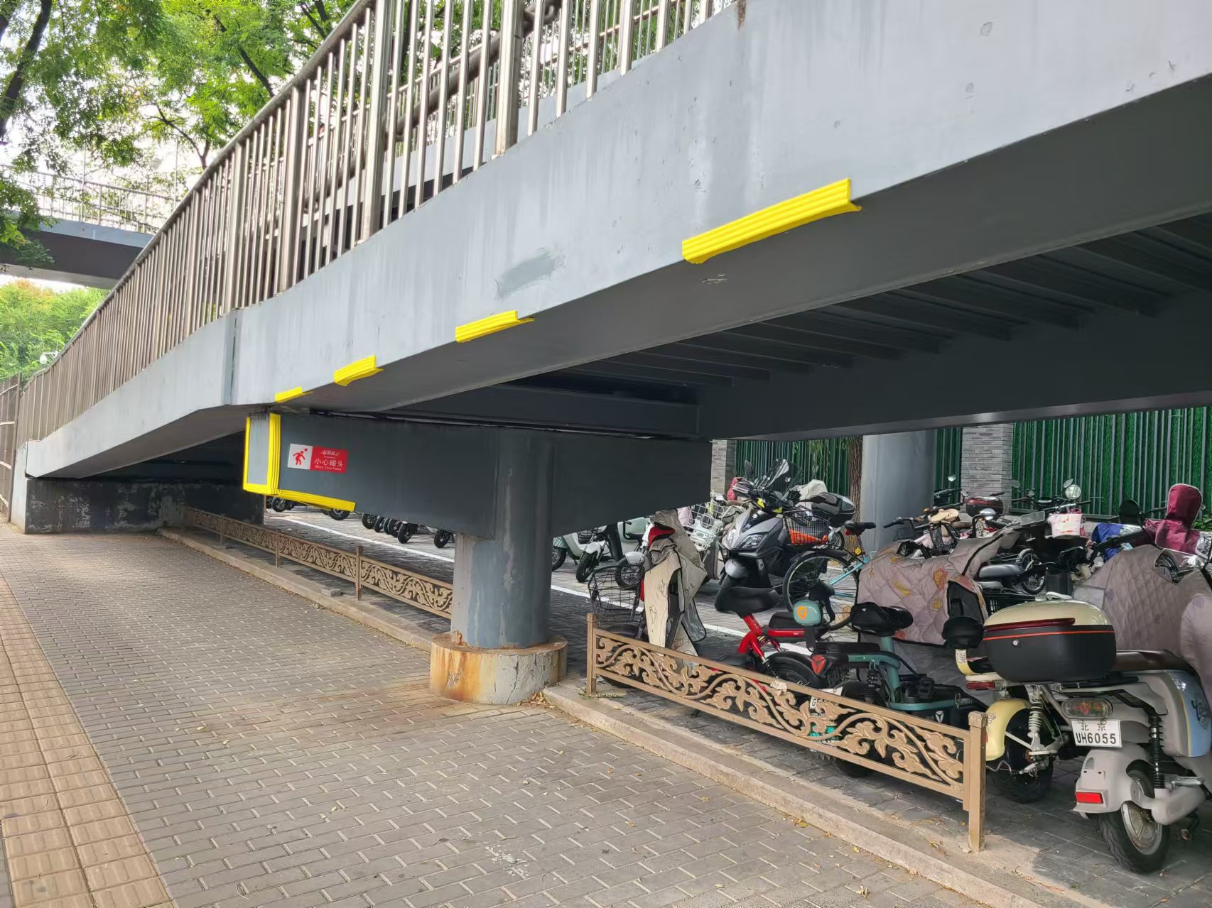 除此之外,天桥下方和北侧均设置了非机动车停放区。有了新的停车区,占道停车现象明显减少,天桥南侧的步行空间变得更为宽敞通畅。在天桥底部较低的位置,还贴有海绵防撞垫和“小心碰头”的温馨提示。地铁站B口周边还同步开展了绿地改造和花卉布景,美化出行环境。