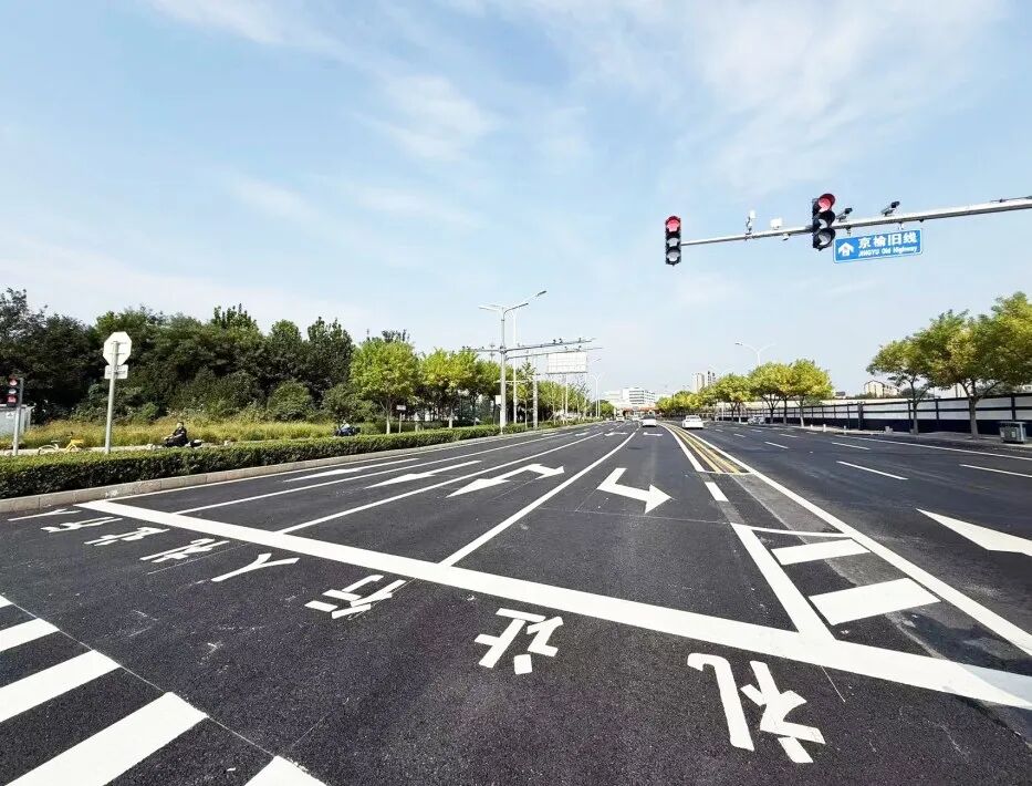 据介绍,京榆旧线与通运路交叉口改造工程于9月12日启动,仅用72小时就完成全部施工内容。通过精细化设计,拆除部分绿化分隔带,将东进口优化为五进三出八车道配置,使路口通行能力得到明显提升。