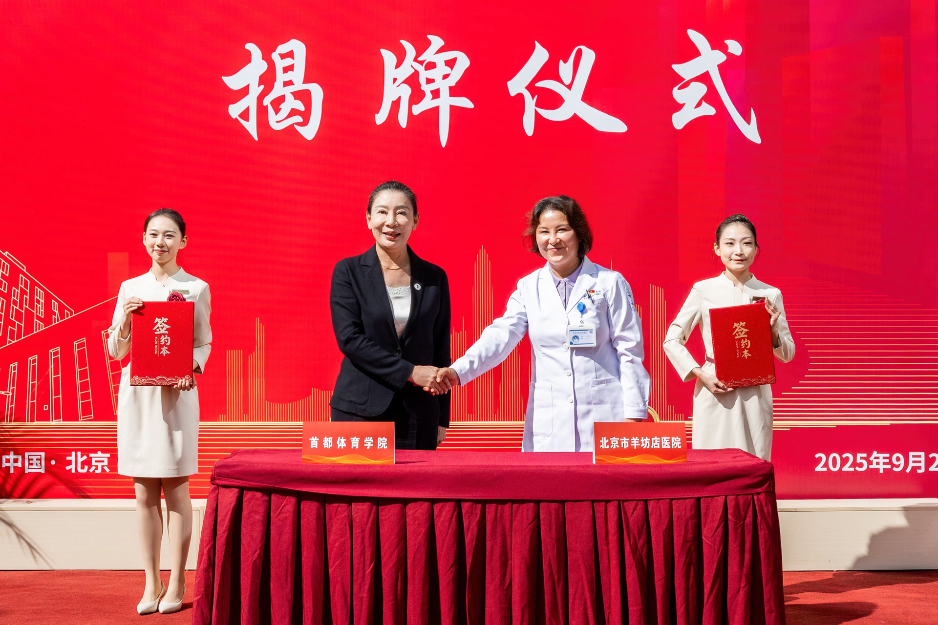 揭牌仪式上,首都体育学院党委副书记、院长张霞与北京市羊坊店医院院长刘雷签署合作协议,标志着双方在体医融合领域迈出了坚实一步。