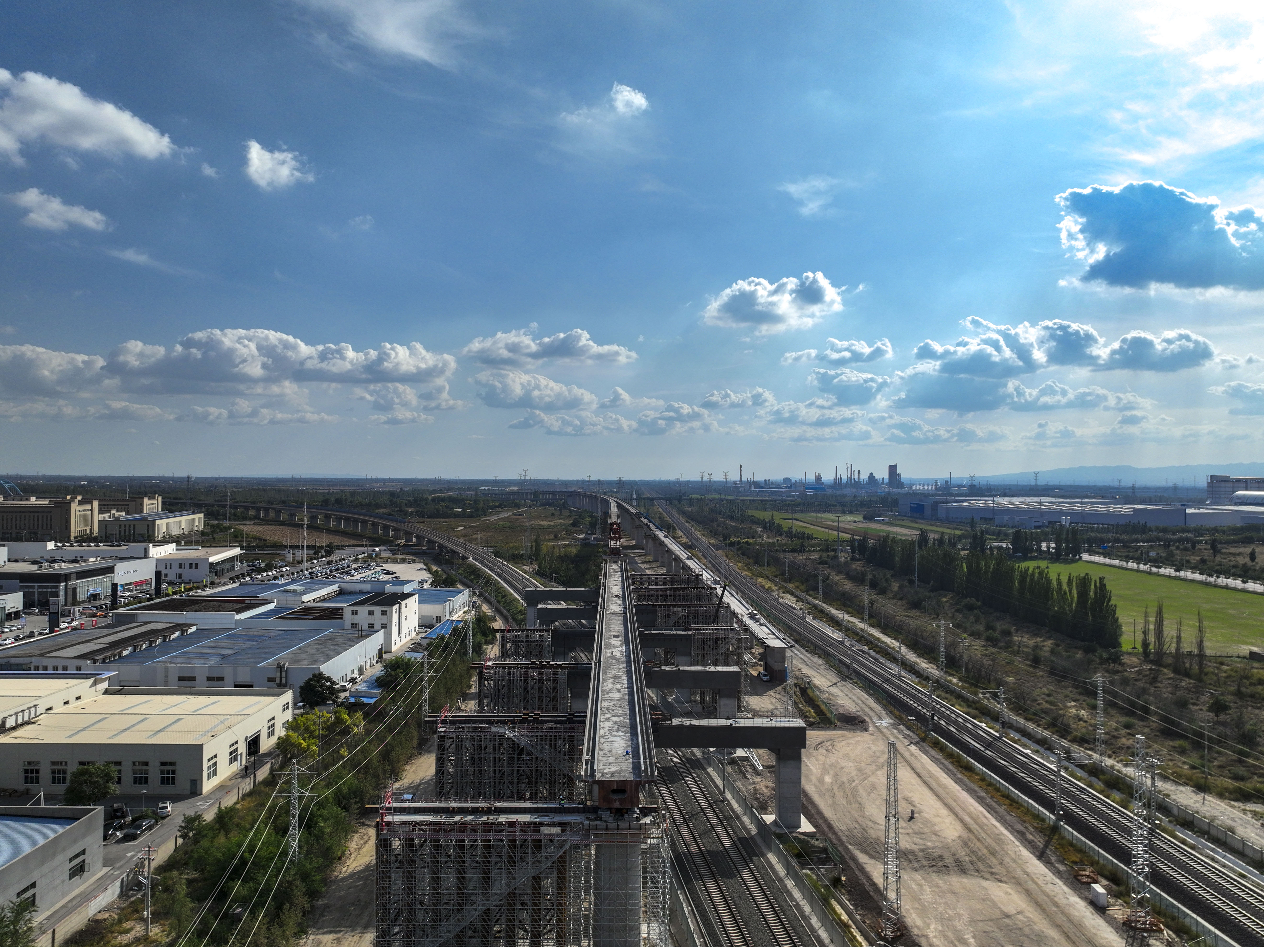 为攻克这一难题,项目部联合宁夏城际铁路公司、设计、监理等各方组成项目团队,通过科学严谨论证,创新采用“旁位预制+拖拉式顶推”施工方案:先在远离银兰高铁的桥梁旁位搭设支架,将每联预应力混凝土连续梁一次性整体浇筑,再通过专业顶推设备依次将两联连续梁缓缓“推”至设计位置。“这种方案不仅减少了对既有铁路运营的干扰,还将工期大幅缩短,同时降低了现场施工扬尘和噪音污染,实现了安全、效率、环保的三重提升。”白剑锋说道。