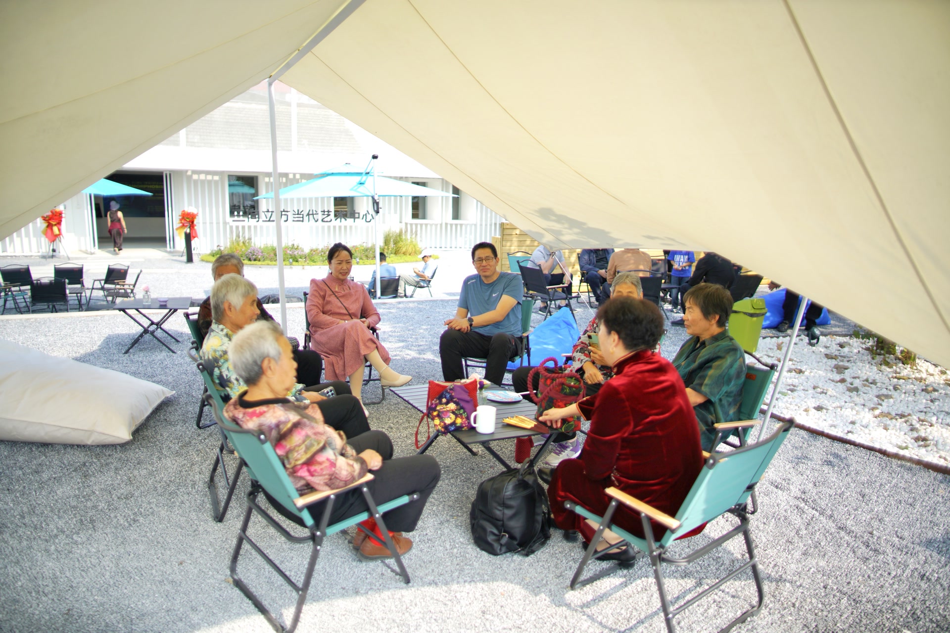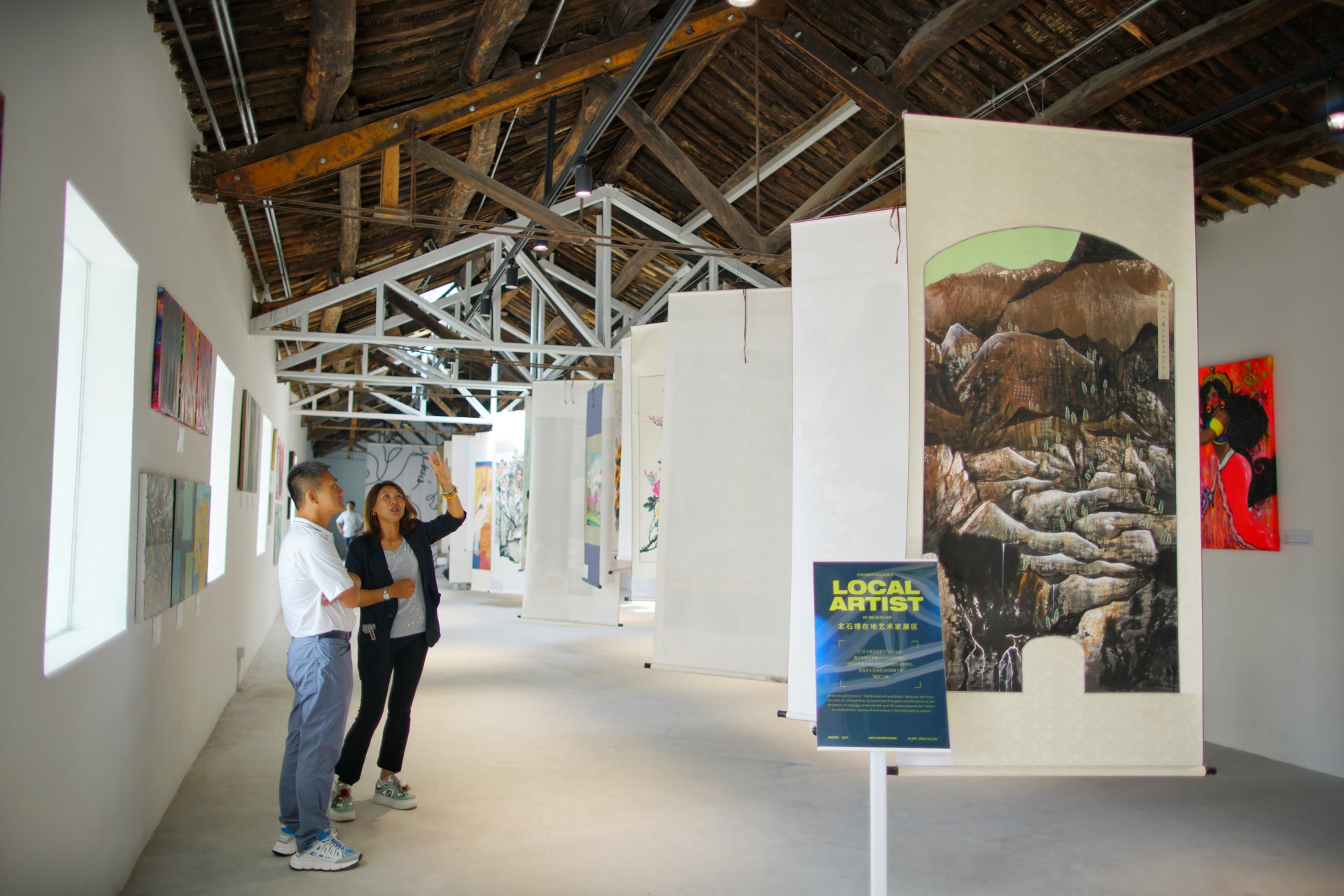 当天的活动以“蝶变新生・乡野共生”为主题,由北石槽镇政府指导,良善Kavya乡野共生部落主办。现场最引人注目的莫过于Kavya三向立方当代艺术中心, 曾经的老旧建筑,变身艺术气息浓郁的艺术中心,阳光透过玻璃窗洒进展厅,内部空间开阔而明亮。展厅里既有线上征集、来自全球的艺术家作品,还设立了北石槽在地艺术家展区,一幅幅当地村民的作品,充满了质朴的生命力和浓厚的乡土情怀,几位村民还现场挥毫泼墨,吸引观众围观欣赏。院落的白墙上,大幅的艺术手绘壁画营造出浓厚的艺术氛围,成为拍照的热门背景。