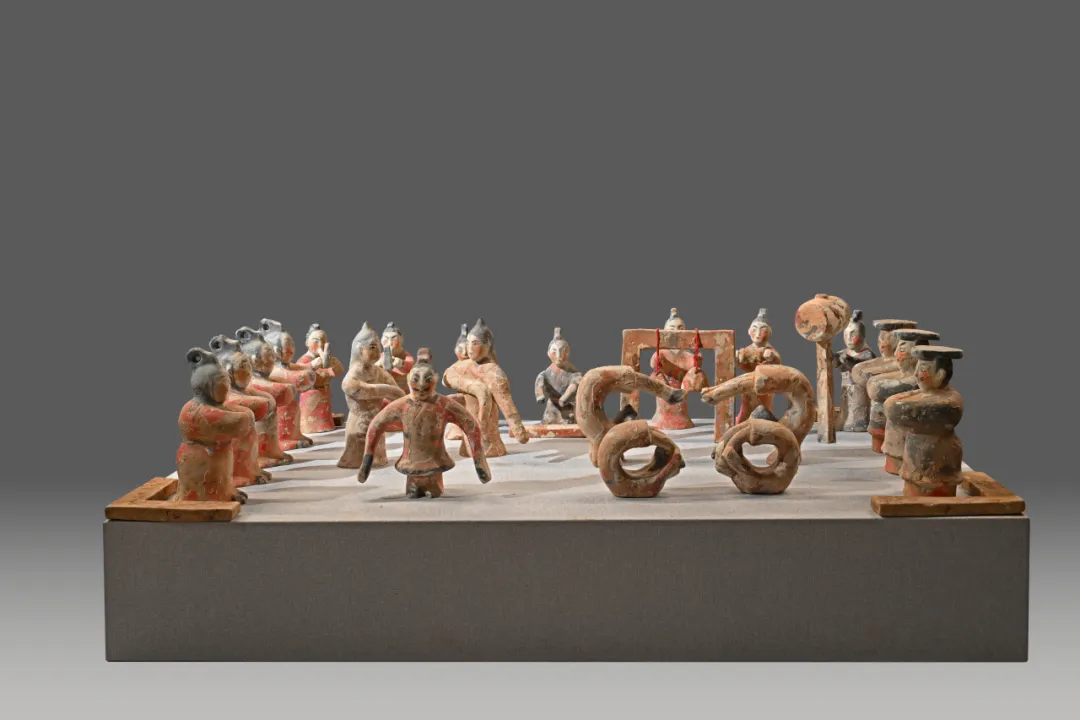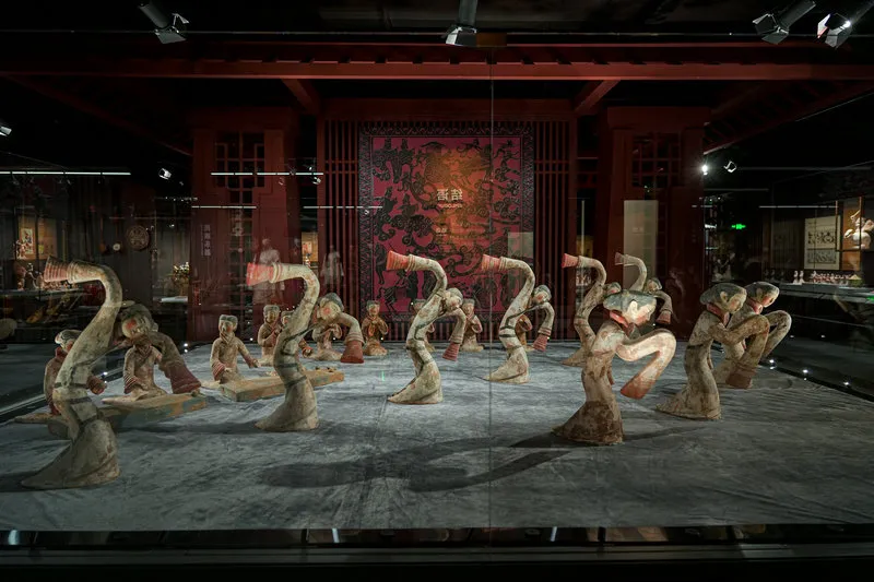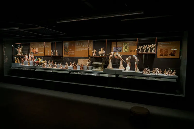 汉代展区以一组徐州驮篮山出土的长袖舞俑群为核心。六尊陶俑分两组呈雁阵排列,前组单袖起舞,后组双袖飞扬,宽大的袍摆如喇叭般展开,完美诠释了“翘袖折腰”的经典舞姿。与之配合的十尊乐伎俑跪坐成列,虽原件乐器已失,但根据同期文物复制的筑、瑟等乐器,再现了汉代乐舞的恢宏场面。