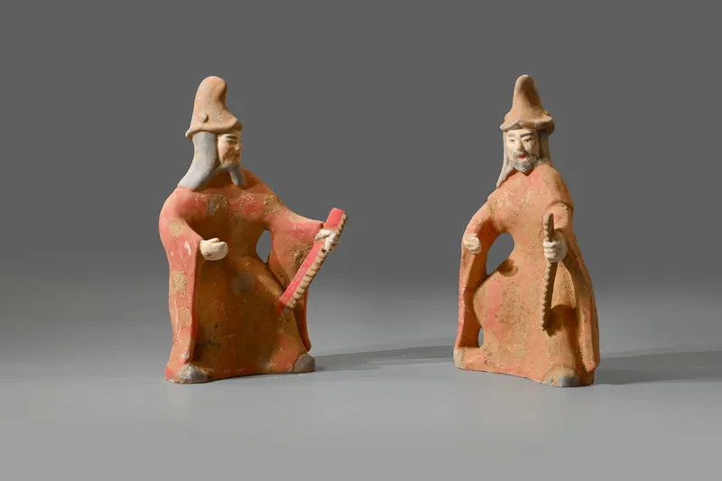 这尊1979年出土于河北磁县茹茹公主墓的陶俑,高29.8厘米,生动再现了北方游牧民族的宗教舞蹈。头戴红色尖顶帽的巫师左手持锯齿法器,身体呈歌舞姿态,浓眉深目的面部特征展现出北方游牧民族的独特风情。