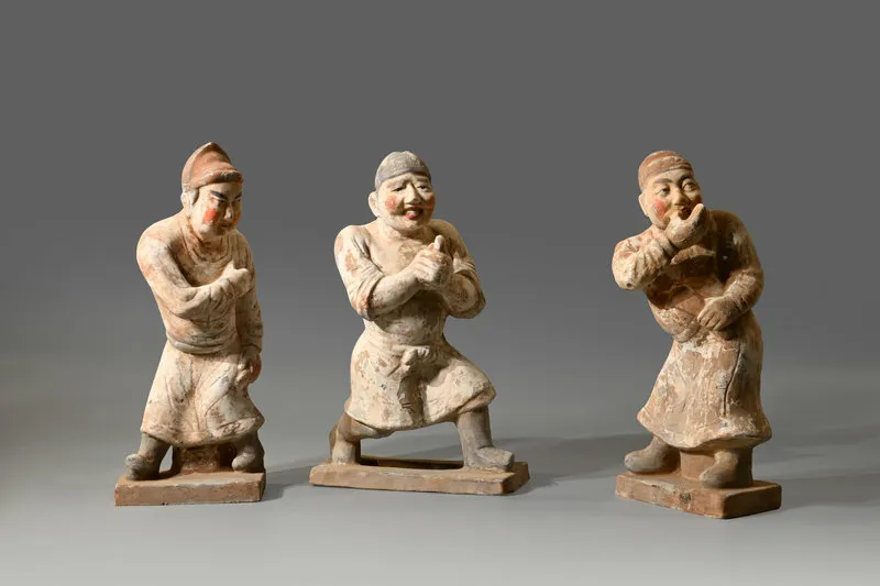 宋代展区内,三尊金代杂技俳优俑正“上演”一场小型戏剧。吹口笛者鼓腮瞪眼,执节板者抬腿欲跃,夸张的表情令人忍俊不禁。河南焦作出土的这组俑证实,杂剧在金元时期已风靡北方民间。