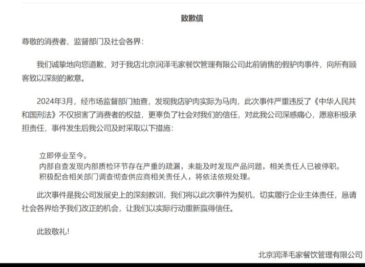 信中称,2024年3月,经市场监督部门抽查,发现该店驴肉实际为马肉,此次事件损害了消费者权益,更辜负了社会的信任,对此该公司愿意积极承担责任。事件发生后,公司立即停业至今。内部自查发现内部质检环节存在严重疏漏,未能及时发现产品问题,相关责任人已被停职。同时积极配合相关部门调查彻查供应商相关责任人,将依法依规处理。