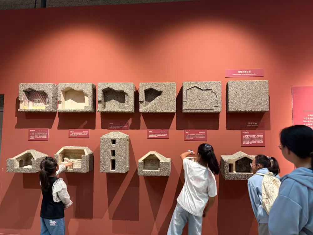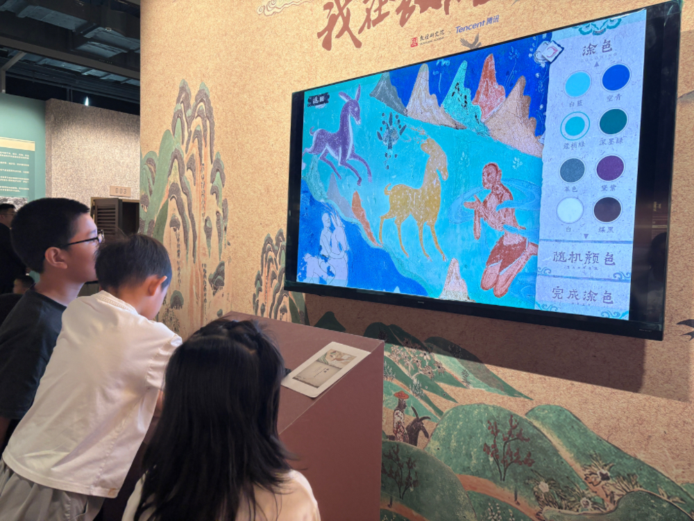 展会正值周末,吸引了大量敦煌市民、国内外游客前来游览。敦煌研究院展区就聚集了很多小朋友,小手摸一摸石窟修建模型;戴上VR眼镜在“寻境敦煌”里沉浸漫游敦煌洞窟;手拿画笔为一幅敦煌壁画重新赋彩……文物承载的千年历史和文化传统就这样在孩子们的眼里、手中“复活”了。