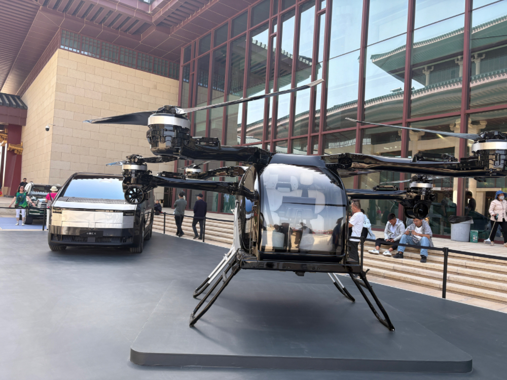 展馆外,停着几辆大家伙。成功燃起人们的好奇心的是一套“陆地航母”分体式飞行汽车,包括一辆旅行车和一台载人飞行器。工作人员介绍,这是一种应用于文旅场景的家用设备,飞行器可以折叠后收纳进汽车后备箱并随时充电,自驾旅游期间在指定的飞行营地低空飞行。