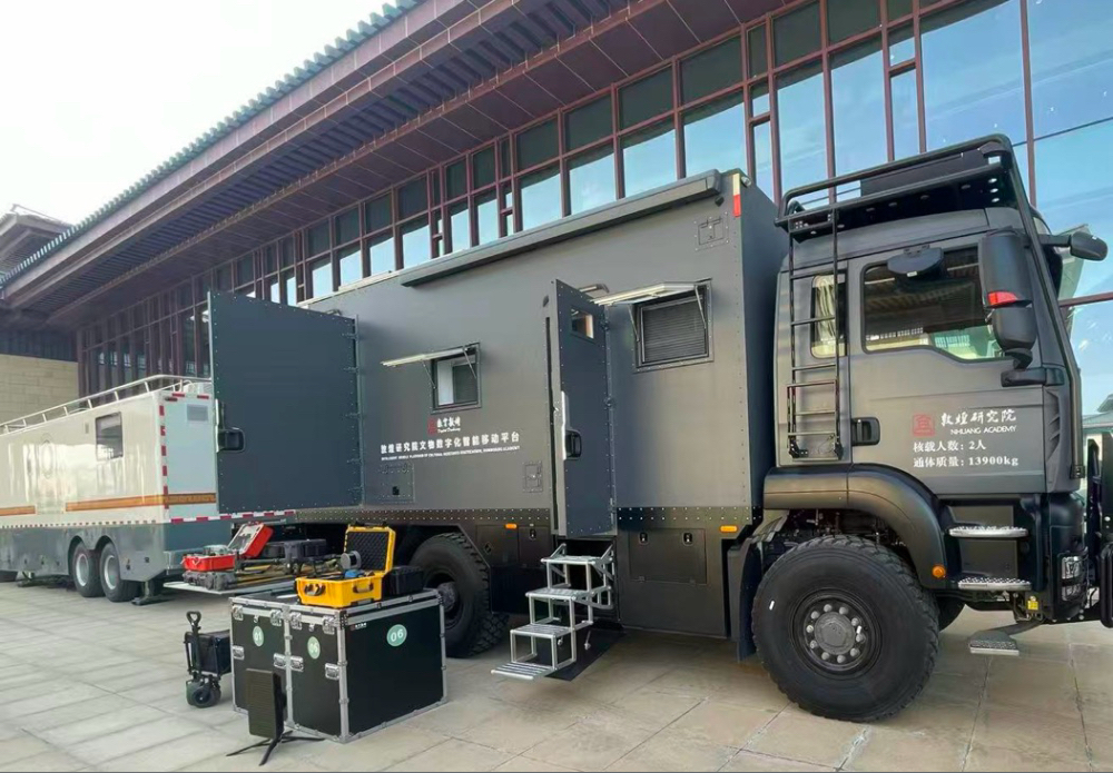 现场一黑一白两辆车更是真正的高科技,它们是我国首台文物出土现场保护移动实验室,针对如何即时有效保护出土脆弱质文物以及文物信息提取滞后两大难题而研发。应用于陕西、河南、山西、湖南、浙江等地100余处考古发掘现场,显著提升了我国文物出土现场整体保护水平。