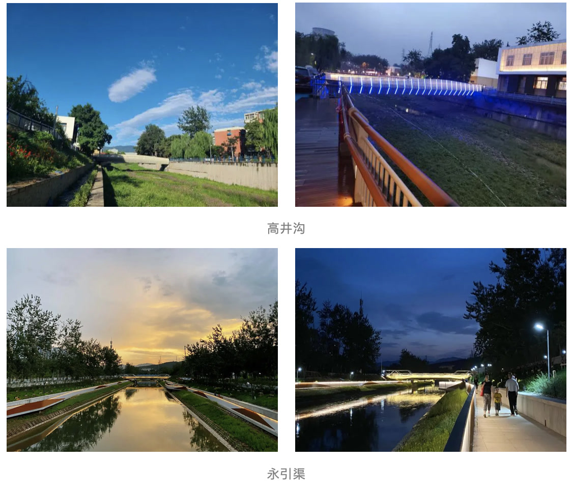 水系景观建设也让河道焕发新生,昔日的防洪河道如今已成为充满活力的生态廊道。永引渠石景山段河道两岸通过建设缓坡、浅滩、绿岛等驳岸形式,依照森林城市标准全面提升绿化景观,新增慢行步道、浅水湾、亲水平台等设施,如今的永引渠,不仅成为市民亲近自然的好去处,更是石景山区一张崭新的城市名片。高井沟冬奥社区段,2公里的河道通过生态调水恢复了自净功能,清澈的河水再次流淌。河道两岸10余公顷的生态景观绿意盎然,蜿蜒的园路与葱郁植被相映成趣,新建的慢行步道和观景平台已经成为了周边居民休闲娱乐的重要场所。