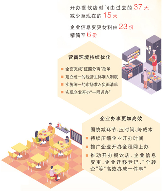 原先需要手动填写的信息变为系统智能生成,申请人只需勾选和核对;表单的流转从线下纸质层层传递,变为系统上动动手指就可办理……餐饮“一件事”改革后,营业执照实现了上午提交、下午出证,食品经营许可证办理时间也从20个工作日缩短到三四天。