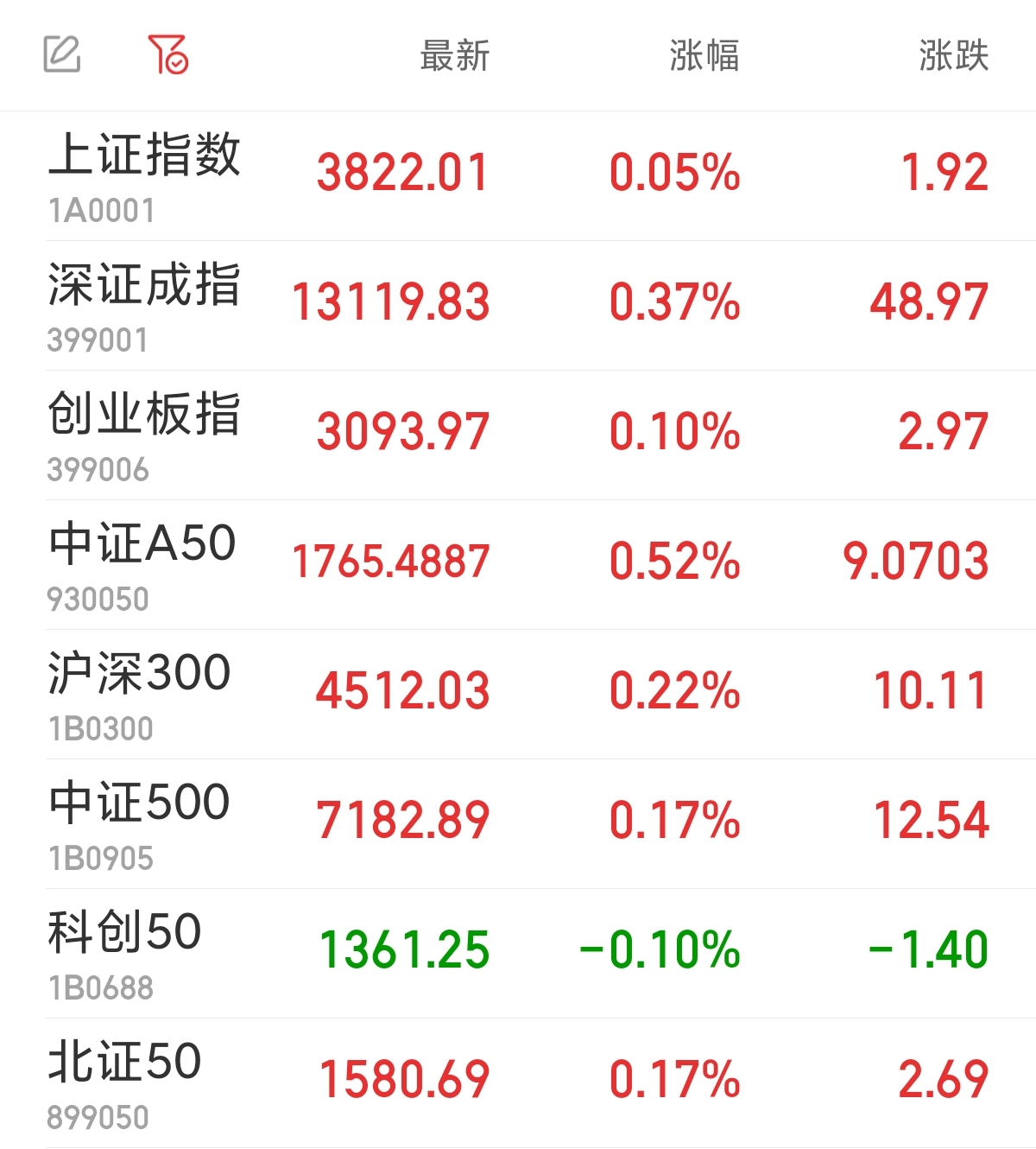 周一,A股三大指数集体高开。上证指数涨0.05%,报3822.01点;深证成指涨0.37%,报13119.83点;创业板指涨0.10%,报3093.97点。