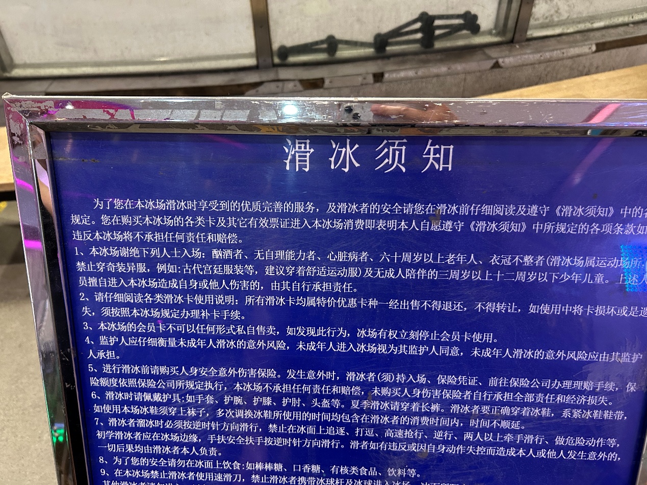 类似的说法,还出现在丽泽16号商场滑冰场,老人想滑冰,同样要签署免责条款。而在八宝山地铁站附近的一家滑冰馆,对于入场顾客的年龄限制则更为严格,连免责协议也没有,60岁以上的顾客不允许滑冰。