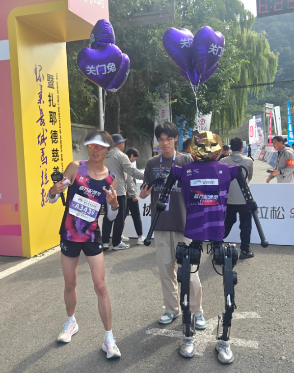 整个陪跑过程中,这台机器人“陪跑兔子”全程在线,没出现丝毫卡顿“掉链子”,一直稳稳陪选手跑到终点线前,用科技感拉满的互动,给了跑者们最后冲刺的底气。其中一名跑者说:“来怀柔太值了!没想到‘怀马’有人形机器人当‘陪跑兔子’,下次还来。”直到冲线结束,不少选手还争着和这位首次亮相、表现称职的“陪跑兔子”合影留念,与它相约下次“怀马”再见。