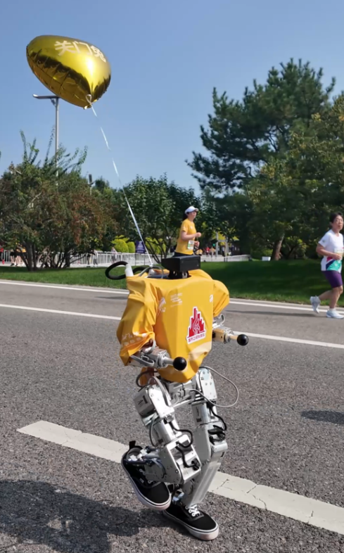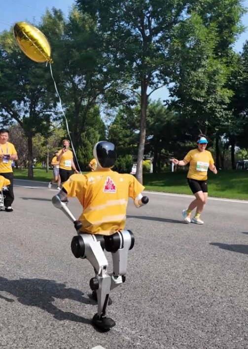 在全马的最后100米,这位身高1.8米、身材匀称、头戴“金钱豹”面具的人形机器人“陪跑兔子”格外吸睛。它训练有素、准备充足,不仅能够跟随选手们的节奏变换配速,而且自带“打气buff”,让选手们瞬间元气满满。它穿着特制跑鞋,脚掌落地轻盈却稳当,双臂随着奔跑节奏有规律地摆动,小碎步迈得不快不慢,恰好跟在选手身侧,既不超前抢镜,也不落后拖节奏,精准卡在“陪跑”的最佳距离。遇到脚步缓慢、快要坚持不住的选手,“陪跑兔子”还会悄悄调整步伐“带节奏”,仿佛在无声鼓励“再坚持一下”。