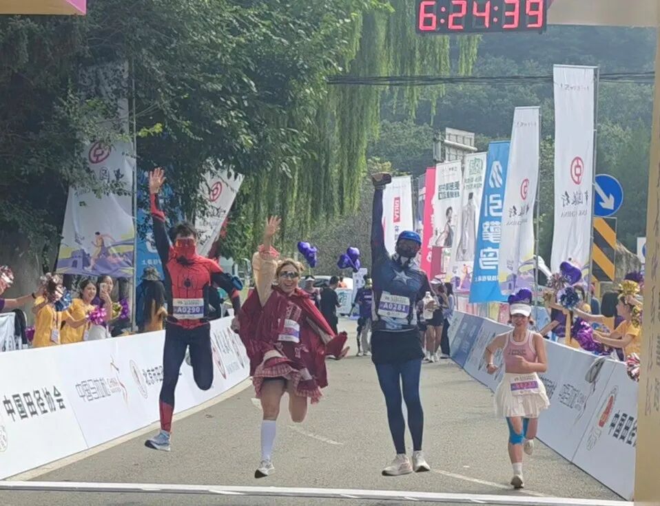 有位选手本来已经跑不动了,看到“陪跑兔子”,突然来了劲头,下意识地跟着它的步伐小跑起来。更有趣的是,几位穿着小红帽、蜘蛛侠服装的跑者,见状直接围到“陪跑兔子”身边,组成“人机小分队”一同冲刺,赛道旁观众的欢呼声将比赛再次推向高潮。