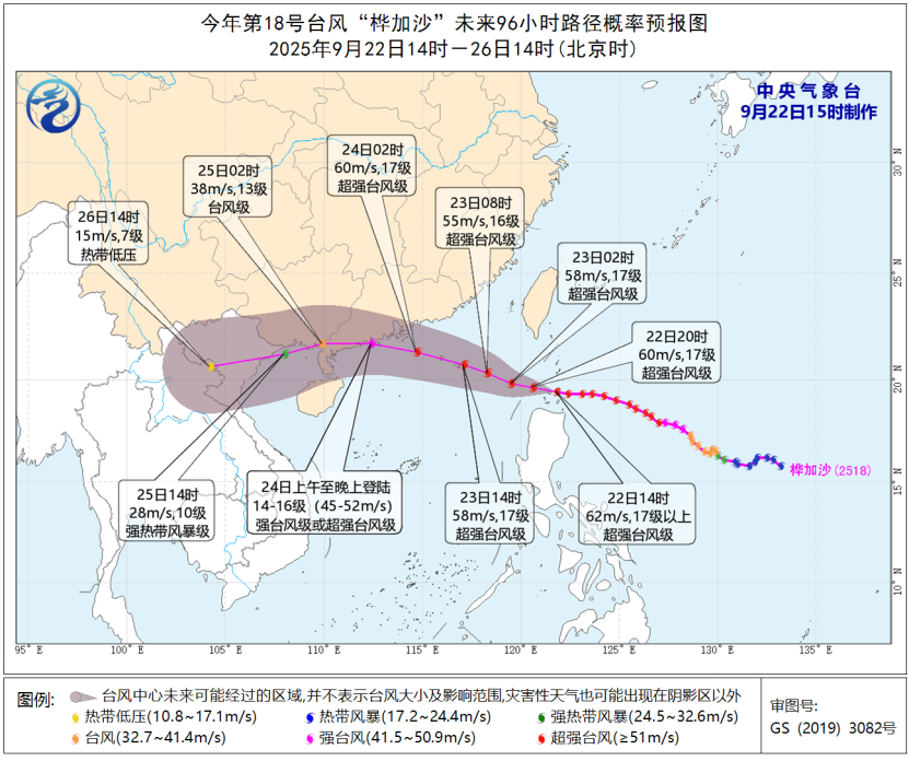 预计,“桦加沙”将以每小时20-25公里的速度向偏西方向移动,穿过巴士海峡后,23日凌晨进入南海东北部海面,并逐渐向广东中部至海南岛东北部一带沿海靠近,将于24日上午到晚上在广东惠州到海南文昌一带沿海登陆(强台风级或超强台风级,14-16级,45-52米/秒),登陆后强度逐渐减弱。