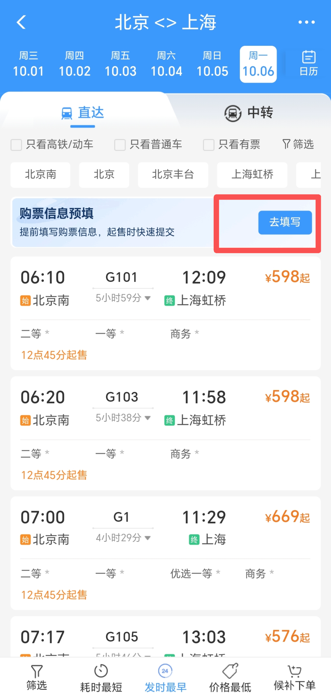 在购票页面点击“购票信息预填”
