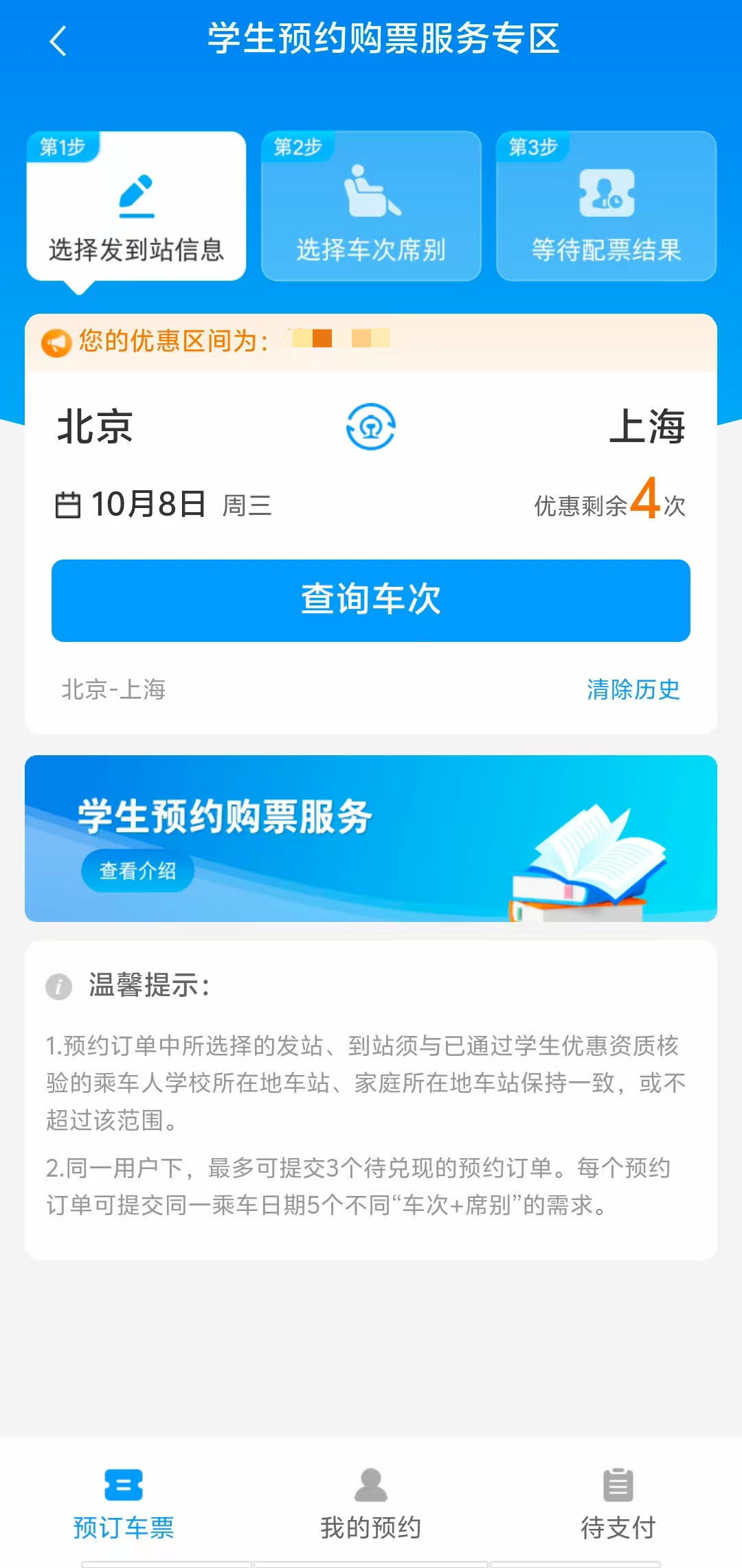 “我的”界面“学生预约购票”专区