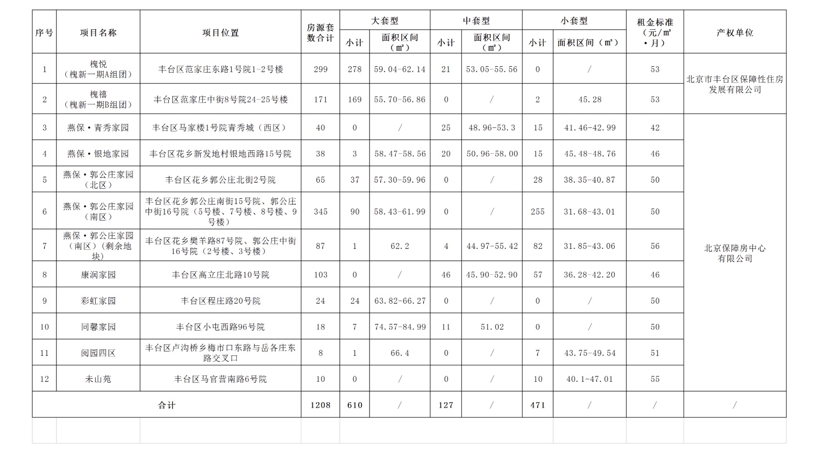 本次配租房源分布于12个项目,多数位于西四环和南四环沿线,区位优势明显,交通较为便利,可较好满足保障家庭就业、就学、就医等实际需求。房源涵盖大、中、小三类套型,其中大套型610套、中套型127套、小套型471套,可匹配不同类型的家庭结构。