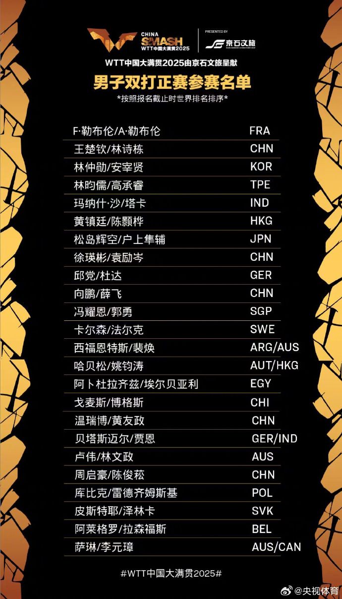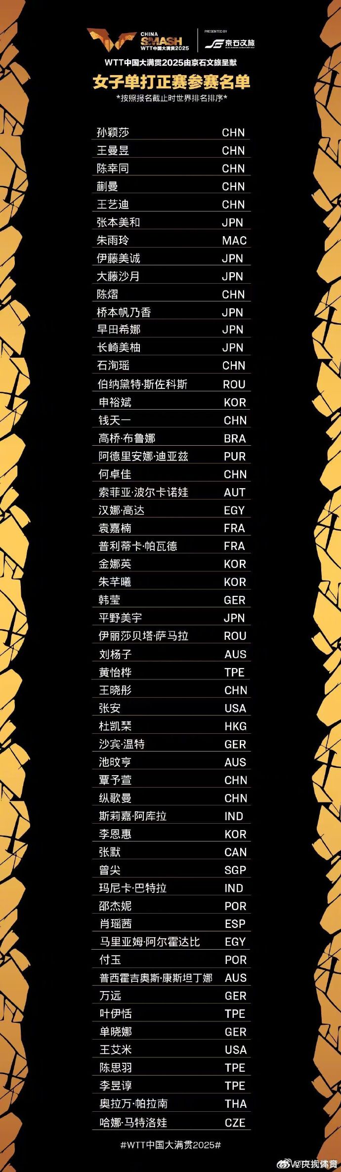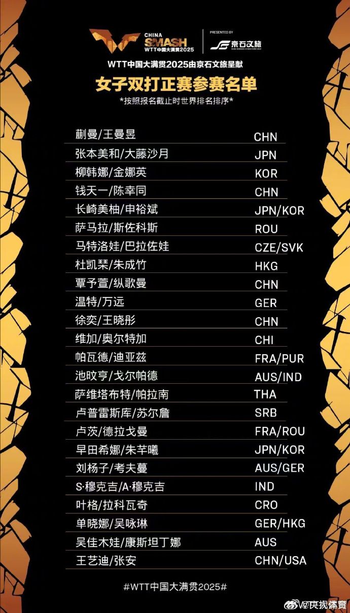 孙颖莎、王楚钦领衔WTT中国大满贯全阵容来啦!9月25日至10月5日,WTT中国大满贯将在北京石景山首钢园举行。9月25日至27日将进行资格赛,决出男、女单打正赛剩余的8个席位。抽签仪式则于9月26日下午举行,正赛于9月28日打响。