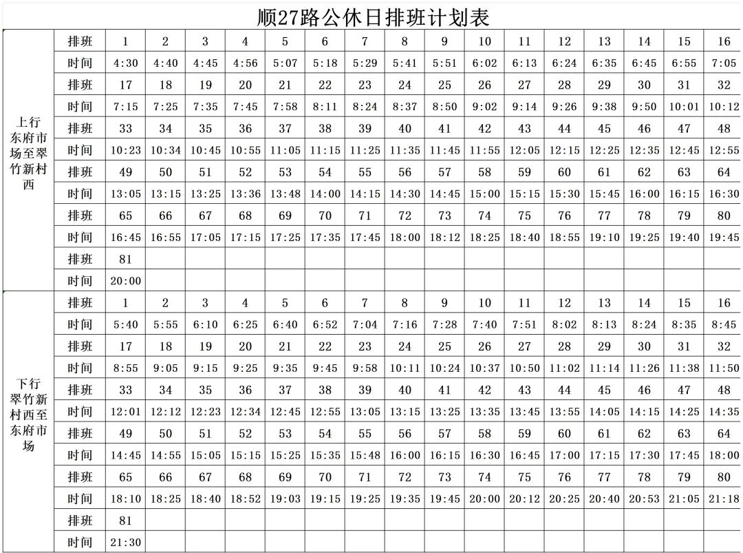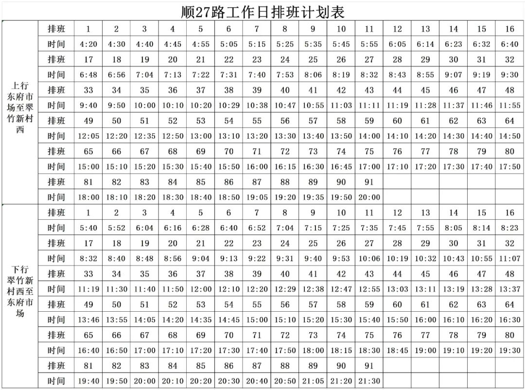 顺27路班次调整后,东府市场至翠竹新村西方向,工作日首班车发车时间为4:20,公休日首班车发车时间为4:30,末班车发车时间均为20:00;翠竹新村西至东府市场方向,工作日、公休日首班车发车时间均为5:40,末班车发车时间均为21:30。具体发车时间可查看下方表格。