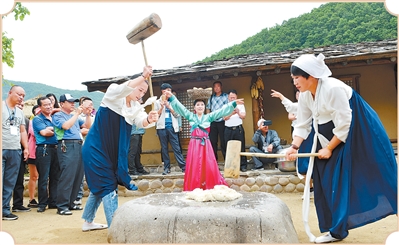 安东老街“金珠打糕店”传出富有节奏感的“咚咚”捶打声和欢快有力的吆喝声,不少中外游客驻足观望。打糕是朝鲜族风味传统食品,每逢年节、寿诞、婚庆等重要场合,总是不可或缺。打糕制作技艺传承人金珠的技艺便源于儿时记忆:“过年过节,蒸糯米、捶打糕的场景至今难忘。大家围在一起,有的帮忙,有的跳舞,那种欢乐氛围特别温暖。”为了将快乐记忆延续下去,她选择以制作打糕为业,学习家族传下来的传统手艺。