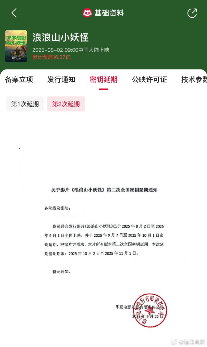 电影《浪浪山小妖怪》宣布密钥延期,将延长上映至11月1日。据猫眼专业版数据,截至当前影片累计票房已达16.37亿。