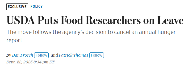 据美国《华尔街日报》22日报道,美国农业部已让一个由联邦经济学家和研究人员组成的团队“无限期休假”,该团队负责一项关于美国粮食不安全问题的政府调查。此前,美国农业部宣布停止2025年度美国《家庭粮食安全报告》数据收集和发布工作。