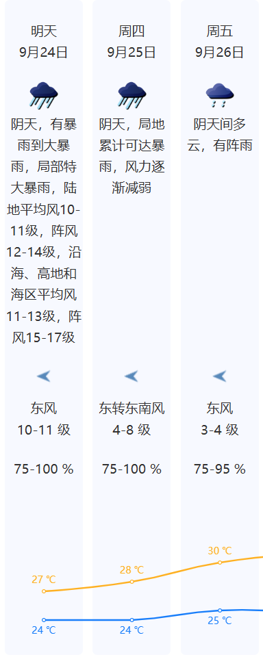 23日傍晚前后全市风力将明显增大,23日夜间到24日是风雨最强时段,致灾风险极高。