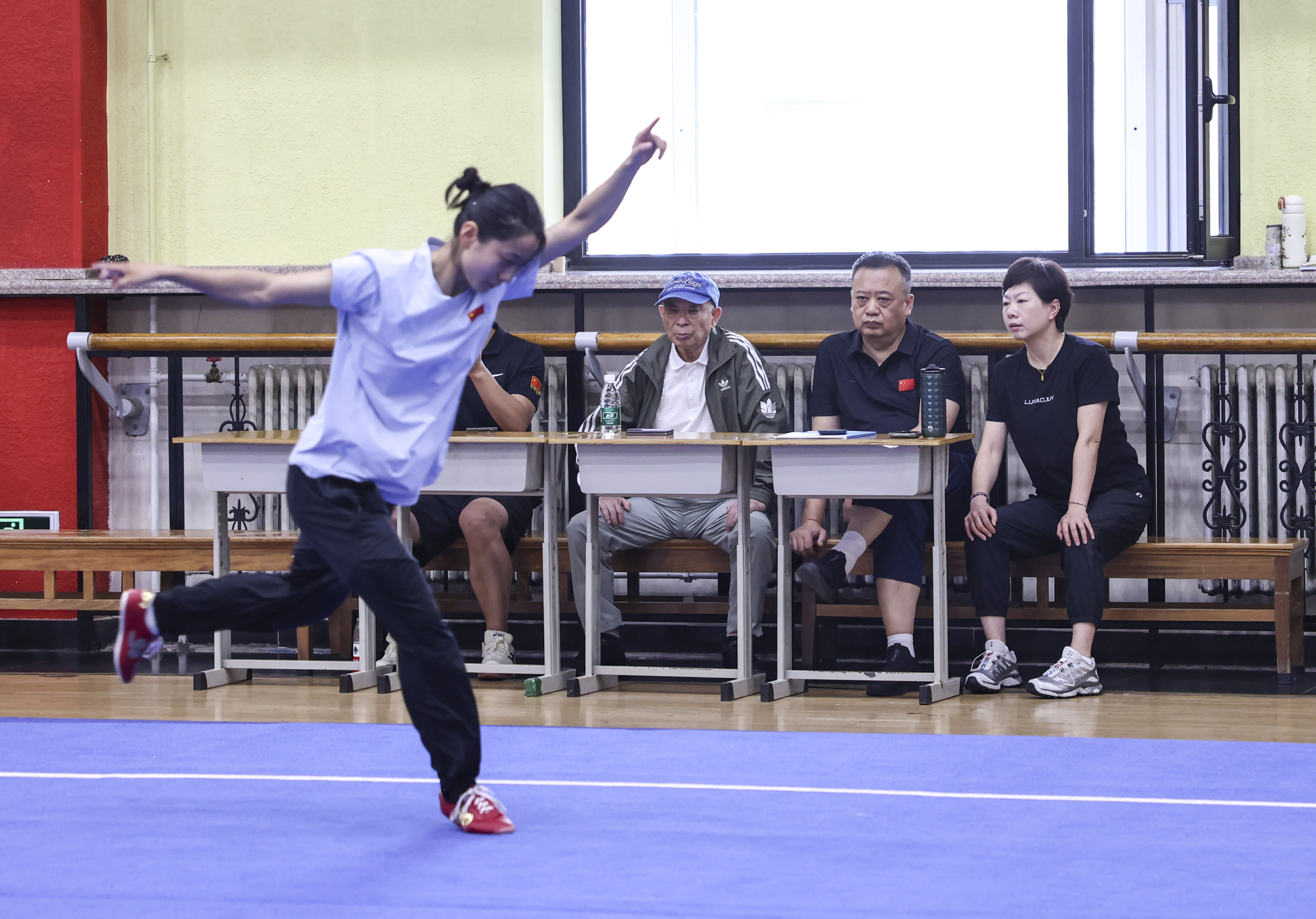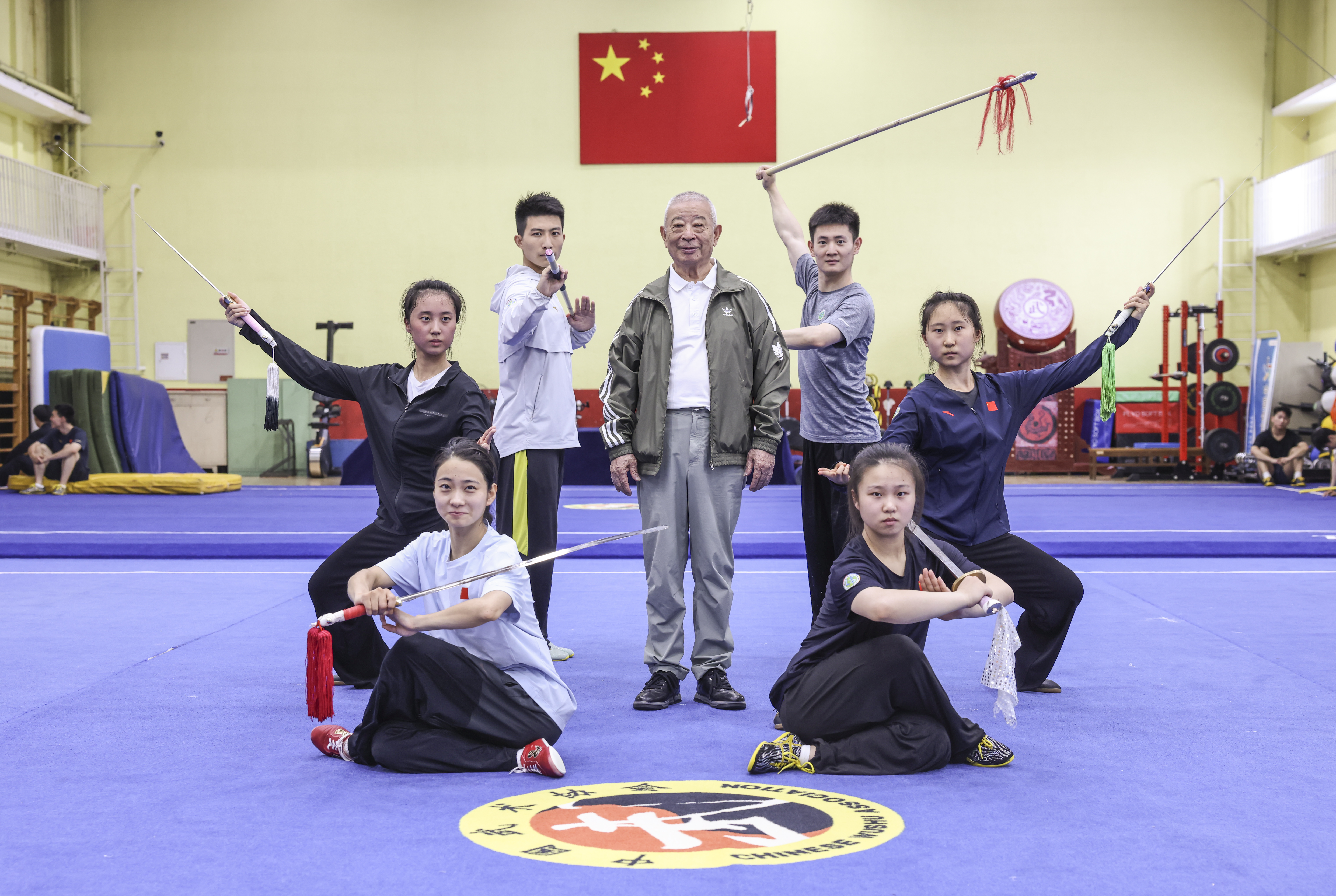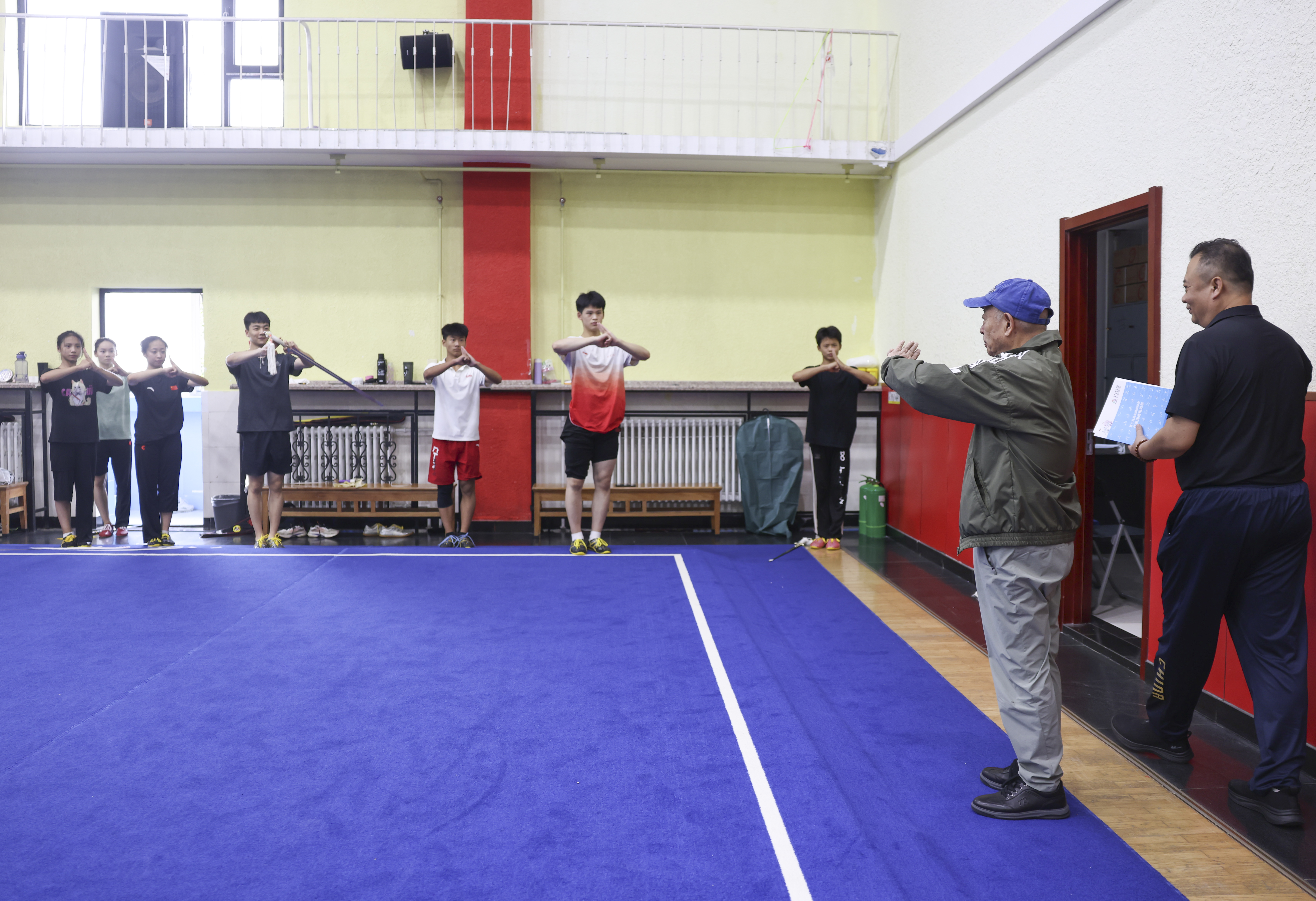 看到吴彬走进训练馆,正在训练的教练、队员们赶忙停下,站定行礼。老爷子抬手还礼,一招一式干净利落。课间休息,一名队员上前行礼讨教,吴彬竖起了大拇指,并提醒他生活中多去听配乐,理解了音乐,才能更好将它融入动作中。