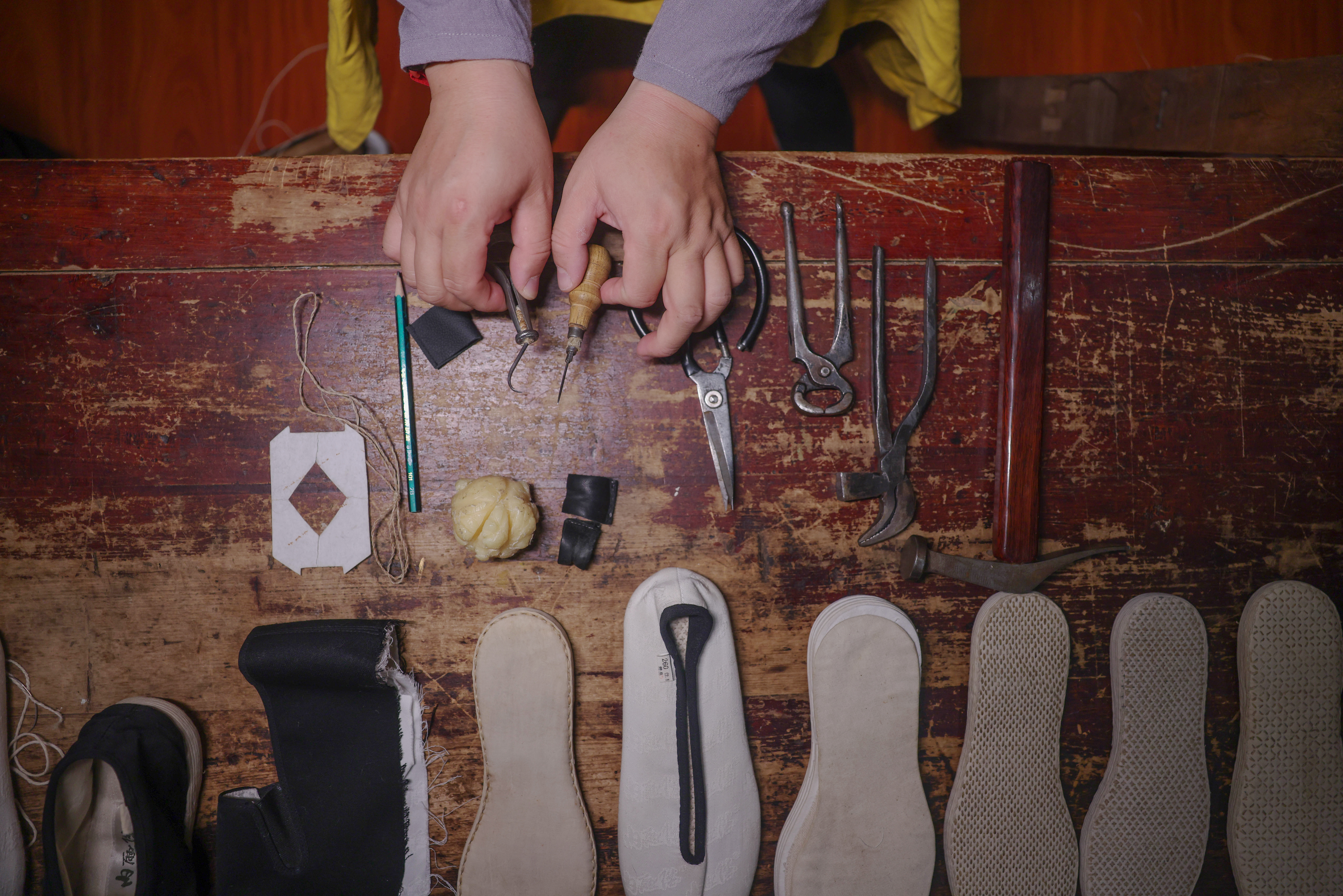 任晨阳2005年入行,2009年正式拜师,2014年出师。出师那天,师父将自己使用过的鸭嘴钳送给任晨阳,这不仅是技艺的延续,更是文化的传承,每一种工具都寓意深刻。师父赠予鸭嘴钳,是希望任晨阳在未来的日子里将每双鞋都绷得更加结实、平整。直到今天,师父的这把工具依然摆放在任晨阳的工具台上。